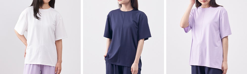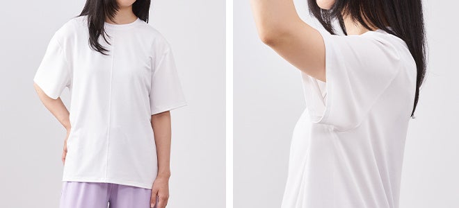 長袖・半袖Tシャツ共に、肌への負担を軽減するため、脇の部分に縫い目があたらないように縫製しました。また、丈に前後差をつけることで気になる腰部分やおしりが隠れるように仕上げています。長袖Tシャツは家事の際、腕まくりをしても落ちてこないよう、腕から袖部分までの形状にもこだわりました。