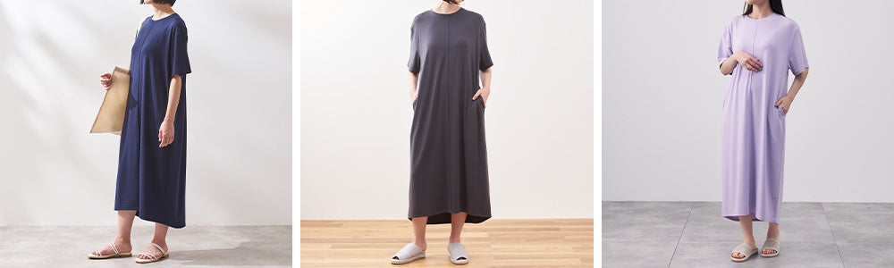 ケユカ リラックスウェアでは快適に過ごせるようゆったりと締め付けが少ないデザインに設計し、気になる部分の体型をカバーできるようmm刻みでサイズの調整を行いました。Tシャツやワンピース等では丈に前後差をつけ、気になる腰部分やおしりが隠れるように設計しています。また、肌触りにこだわり、速乾性があり、肌あたりがなめらかで柔らかい素材を採用。サイズは154~168㎝の方に着用いただけるようにフリーで展開します。