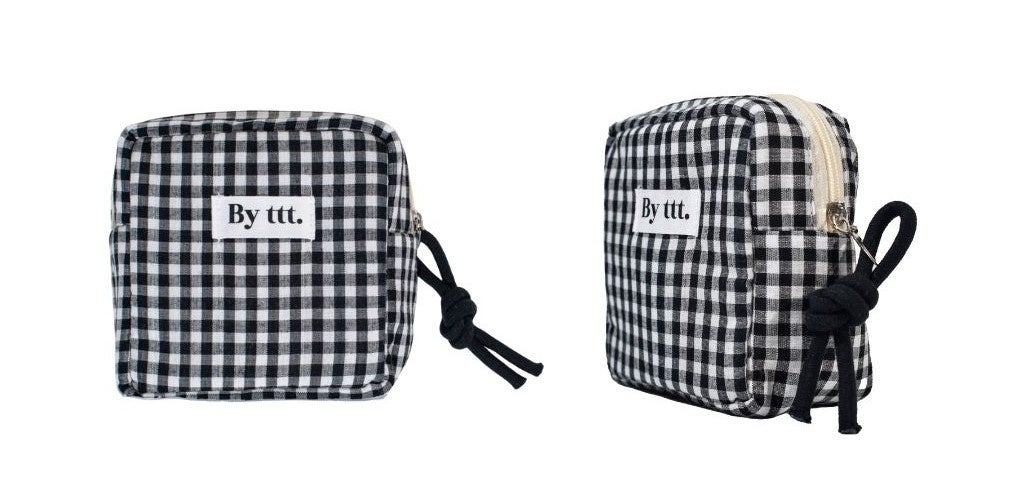 ギンガムチェック柄を使用した、コンパクトなのにしっかりと容量のあるスクエア型ポーチ。
