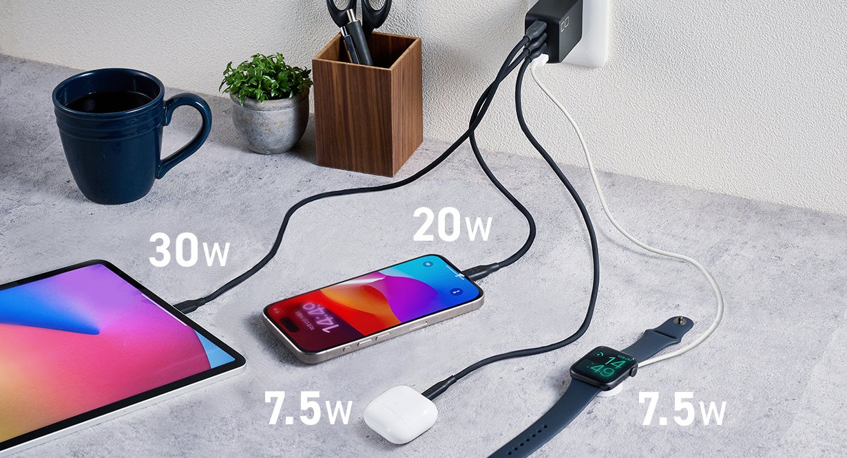 スマホ(10W)、モバイルバッテリー(20W)、イヤホン(5W)、ゲーム機(30W)といった組み合わせまで様々なデバイスの充電をスッキリと1台で賄うことができます。