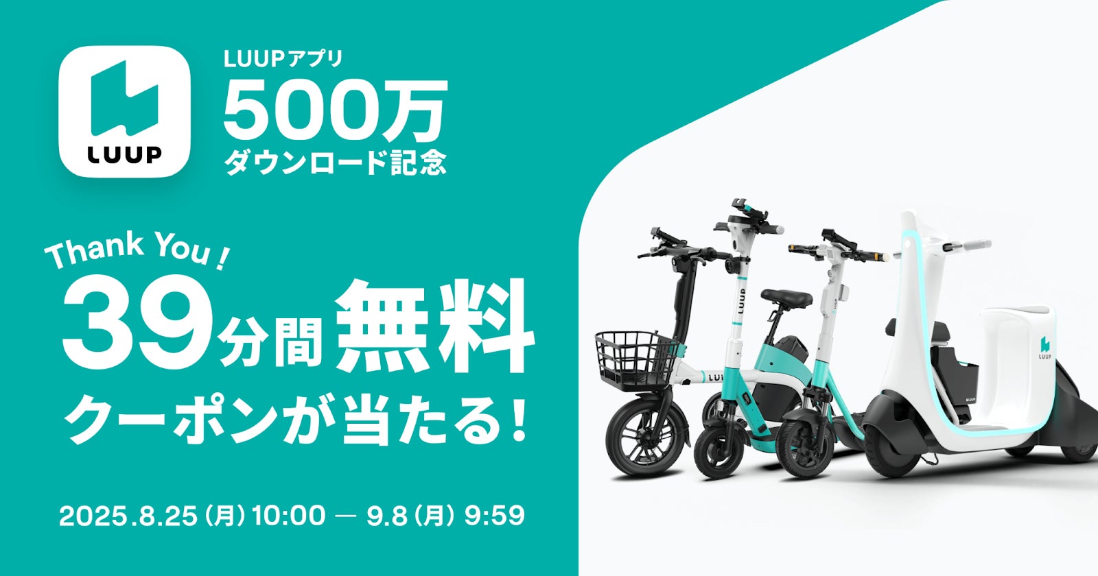 株式会社Luup(本社:東京都品川区、代表取締役CEO:岡井大輝、以下「Luup」)は、2025年8月でマイクロモビリティシェア「LUUP」の公式アプリが500万ダウンロードを突破したことを記念し、抽選で500名様にライド料金が39分間無料になるクーポンが当たるキャンペーンを、2025年8月25(月)から9月8日(月)まで開催します。なお、本キャンペーンは電動キックボード・電動アシスト自転車どちらも対象となります。