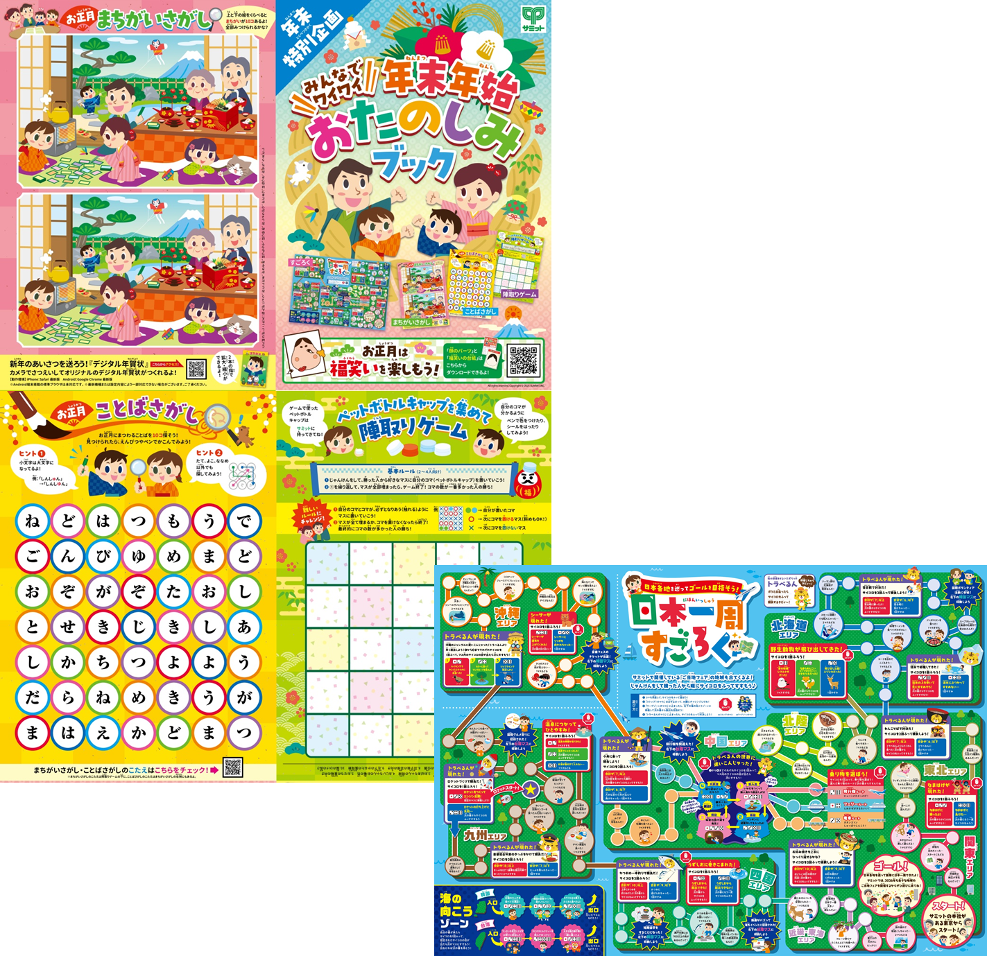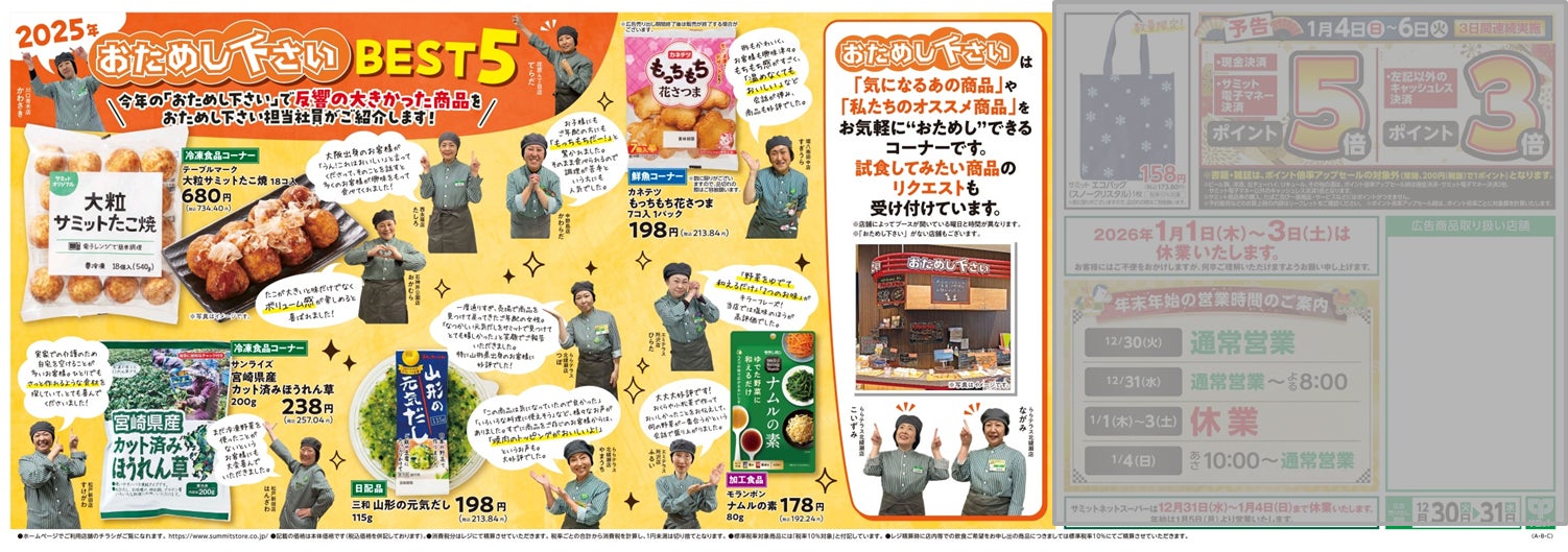 サミットの“楽しみのあるチラシ”として、今年開催された社内コンテストの受賞社員による「SUMMIT MUSICAL」と、「おためし下さいBEST5」を実施します。また、お家でたのしめるゲームがたくさんつまった「年末年始おたのしみブック」を店頭にて配布いたします。