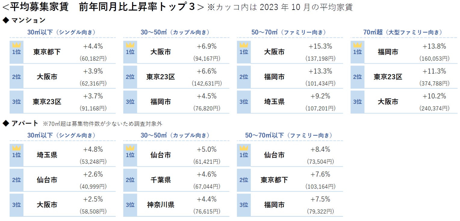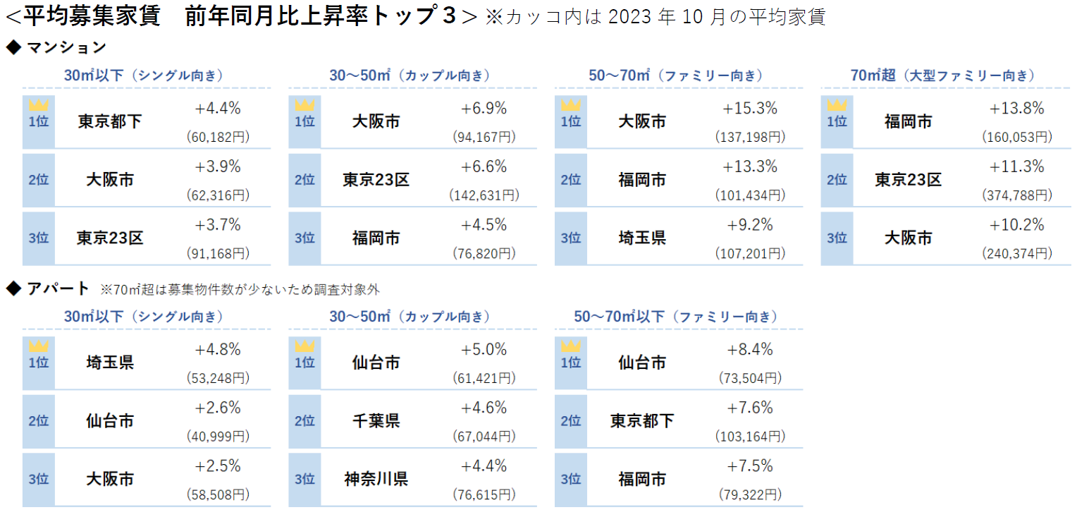 マンションの平均募集家賃は、東京23区・東京都下・埼玉県・千葉県・名古屋市・大阪市・福岡市の7エリアが全面積帯で前年同月を上回る。