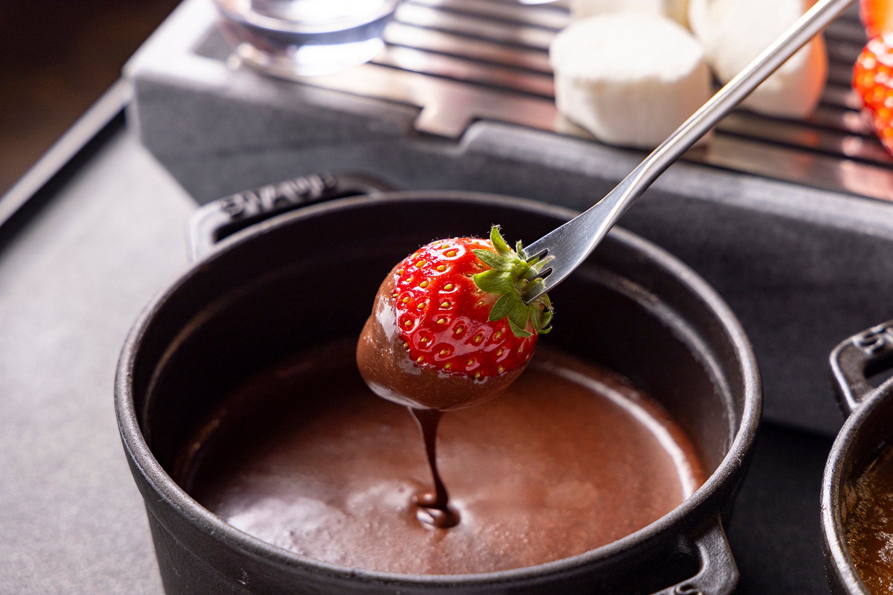 とろけるチョコレートフォンデュは、フランスの高品質なチョコレートブランド「ヴァローナ」が提供する、濃厚で風味豊かなチョコレートを使用。カカオ分55%で、まろやかな甘さとほどよい苦みを持ち、豊かなカカオの香りを楽しめます。口の中でとろけるチョコレートと、フルーツの酸味が織りなす絶妙なバランス、そして、シャンパンの微細な泡が、甘さと酸味を引き締め、華やかな余韻を演出します。