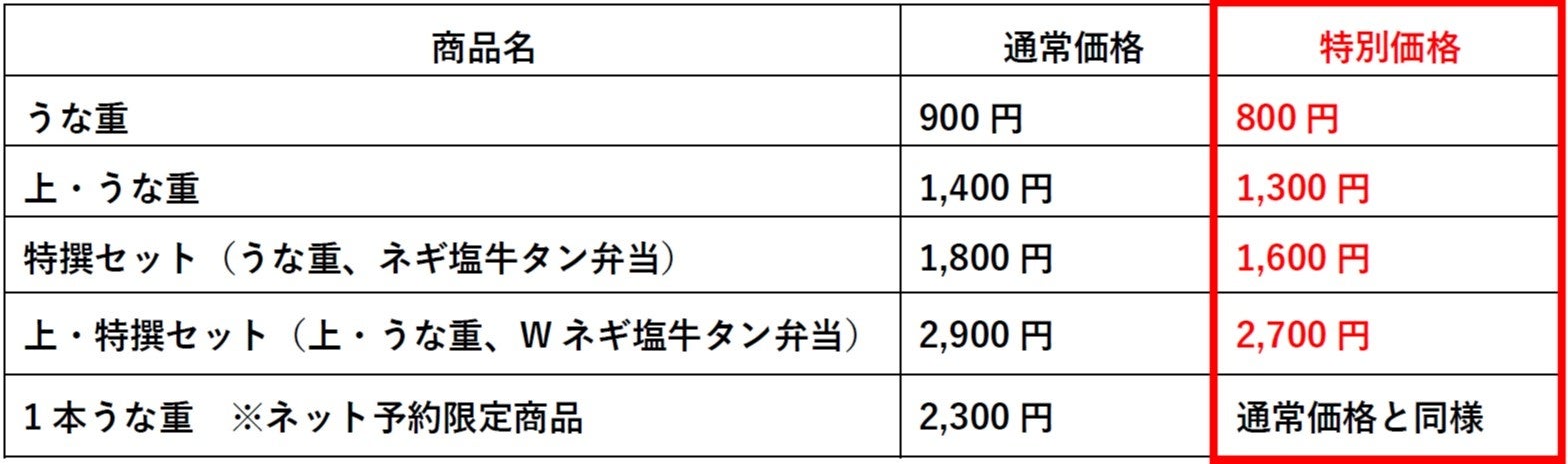 6月22日(木)より7月25日(火)の期間に、店頭や予約サイトよりご予約いただくと、7月30日(日)の土用丑の日を含む3日間の受け取り限定で『うな重』『上・うな重』を100円引きでご購入いただけます。また、7月25日(火)より新発売の『ネギ塩牛タン弁当』または『Wネギ塩牛タン弁当』とうな重を組み合わせたセットメニューも予約割引の対象です。新商品とのセットを最大200円引きで購入できるお得なチャンスをぜひご利用ください。