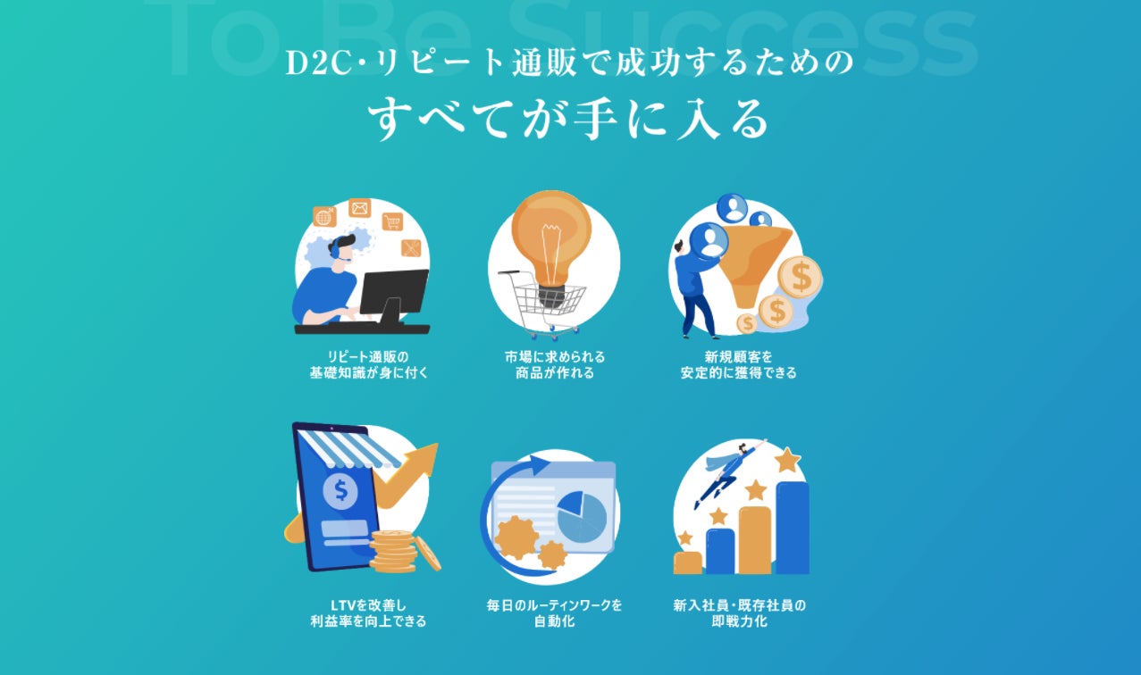 企画 製造 販売 のノウハウを学び、全てお任せで新しく社員を雇わず、たった1商品で億越えの新規事業を創るアカデミーとなっております。D2Cのノウハウを出し惜しむことなく1から解説しております。全6章(約3600分)に及ぶオンライン講座のカリキュラムをご用意。新規参入をご検討の方から、立ち上げてみたもののどう進めて良いか分からない、改善点が分からない、など様々な悩みを一挙に解決致します。