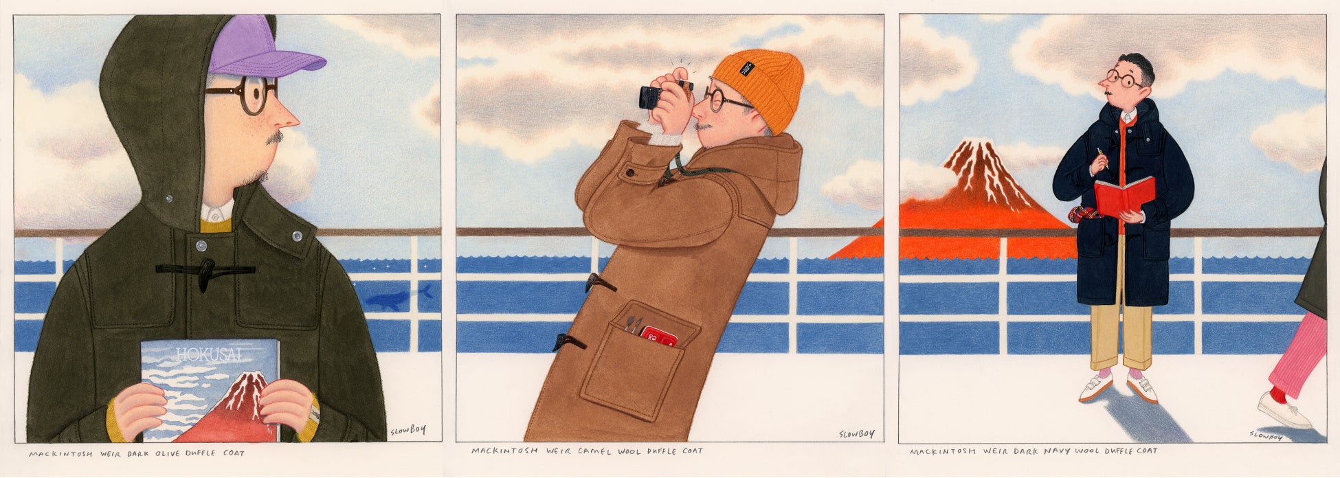 今回新たに販売するMackintoshの為に書き下ろした本シリーズは、「ダッフルコート」がテーマで、アーティスティックディレクションは葛飾北斎の冨嶽三十六景シリーズの『凱風快晴』から着想を得ています。