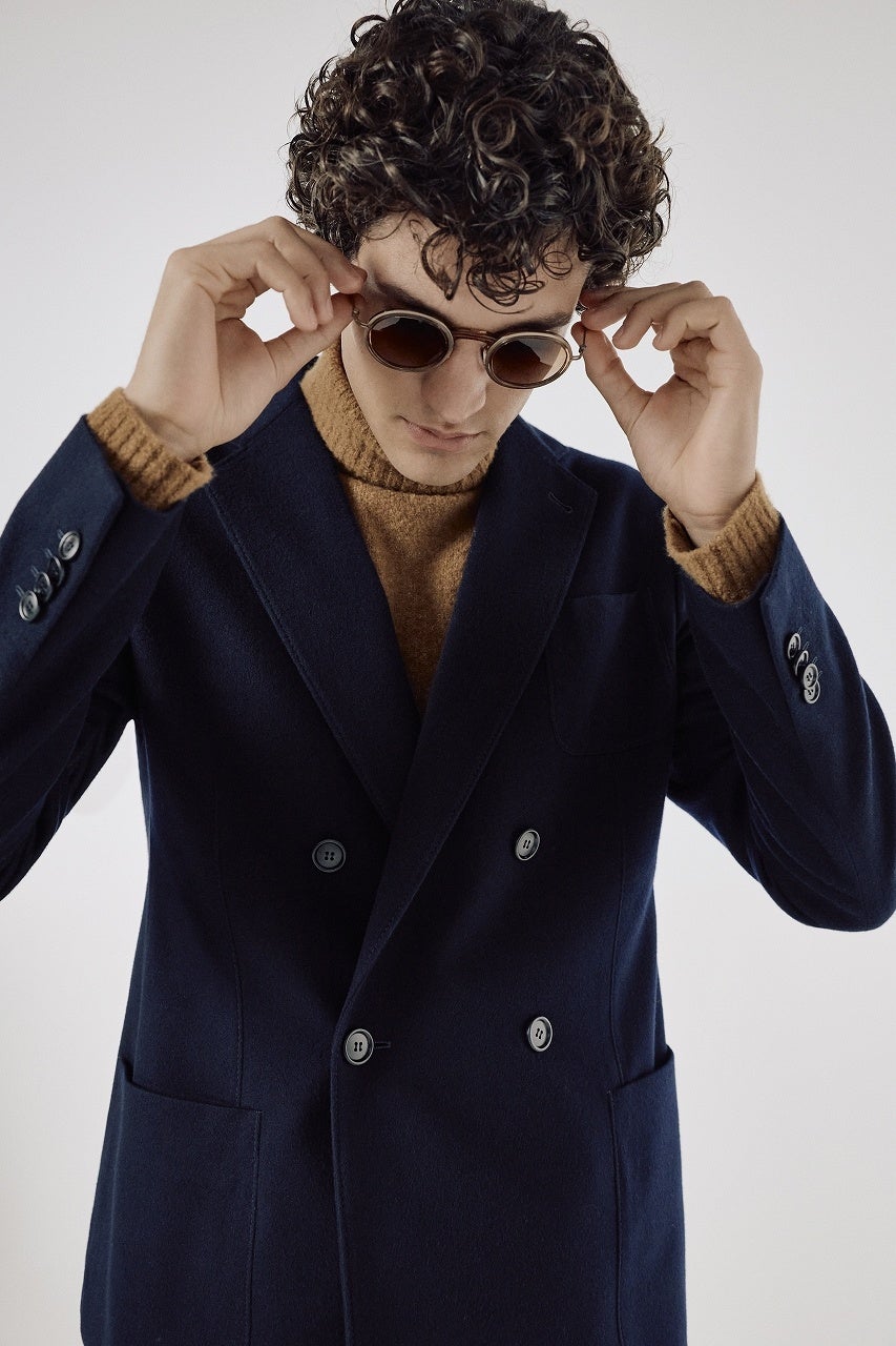 ダブルブレステッドのテーラードジャケットは、パンツとのセットアップで、クワイエットラグジュアリーな装いが完成。
