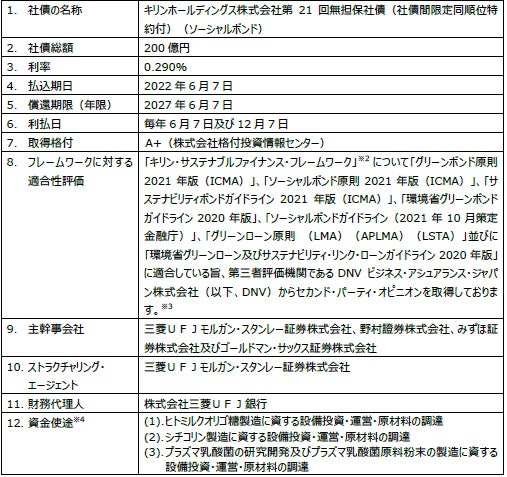 キリンホールディングス株式会社(社長 磯崎功典)は、2022年5月12日(木)にプレスリリースでお知らせしておりました国内公募形式のソーシャルボンドの発行条件を下記のとおり決定しましたので、お知らせします。