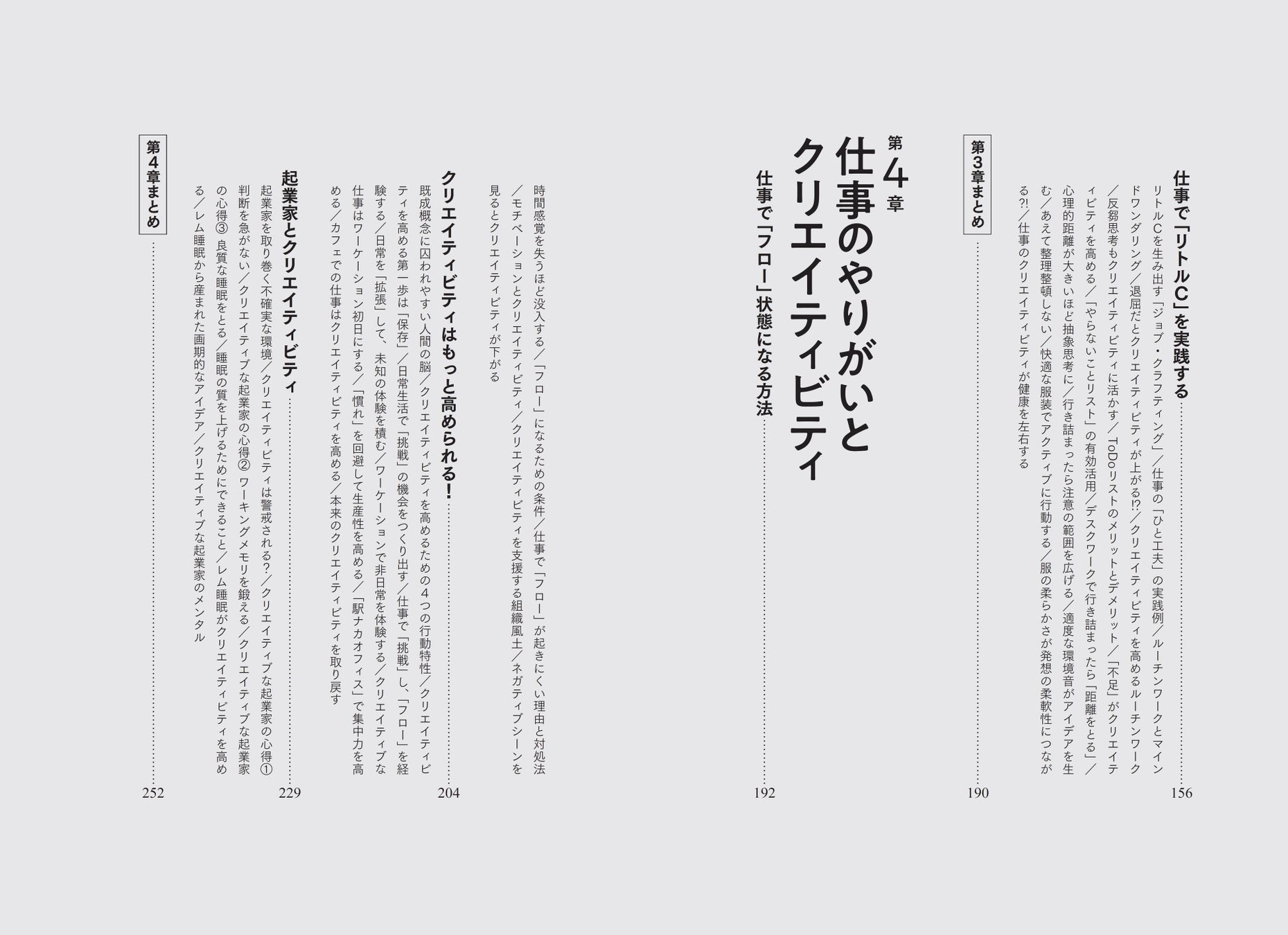 著者は「小さなクリエイティビティ(リトルC)」を発揮できれば、メンタル不調にならないと主張し、それを発揮する方法や、「仕事のやりがい」を高めるために起こす行動を、学術的エビデンスや自身の実践経験、そして著者の会社が自律神経などの生体情報をウェアラブルセンサで測定してきた経験をもとに解説しています。