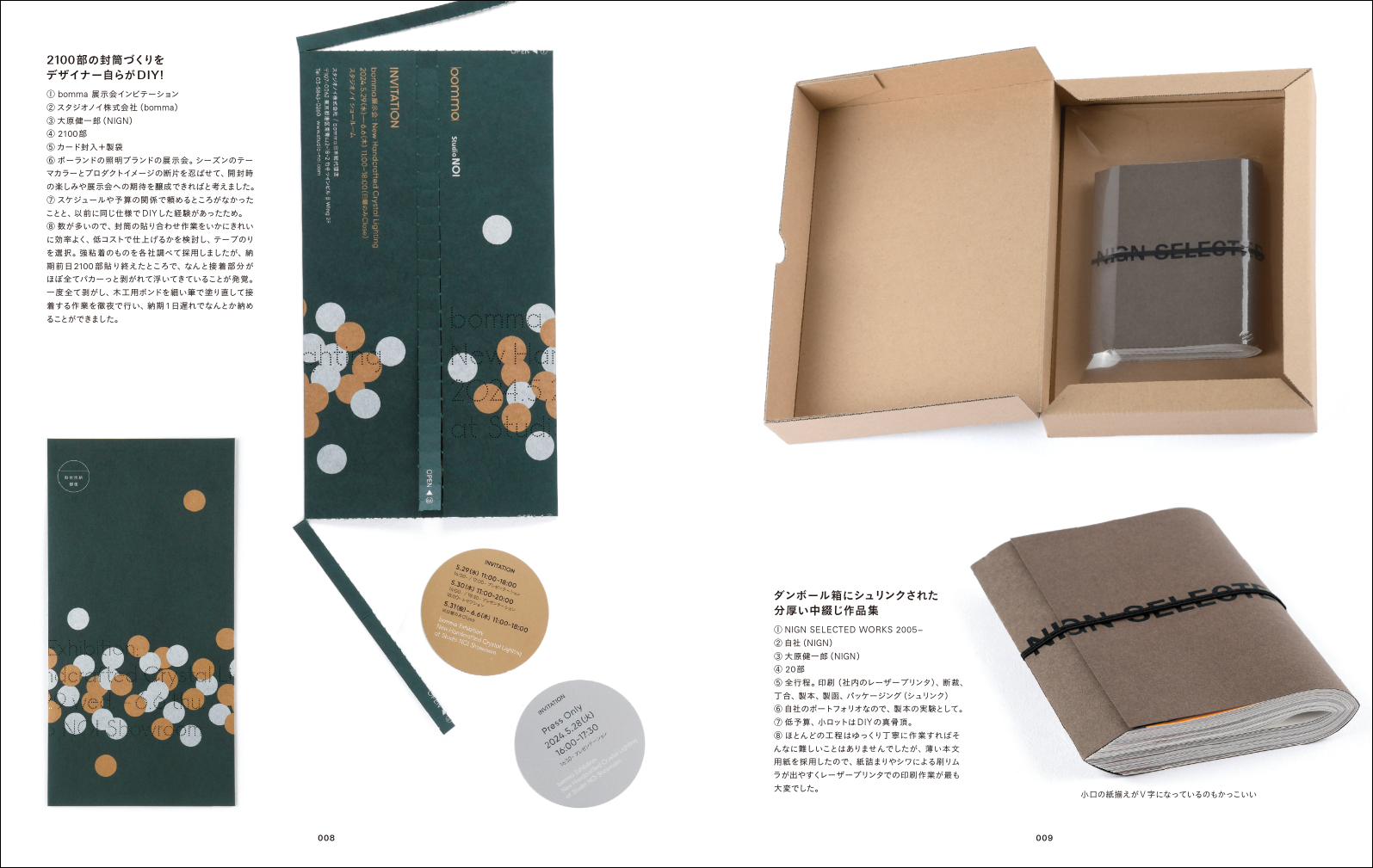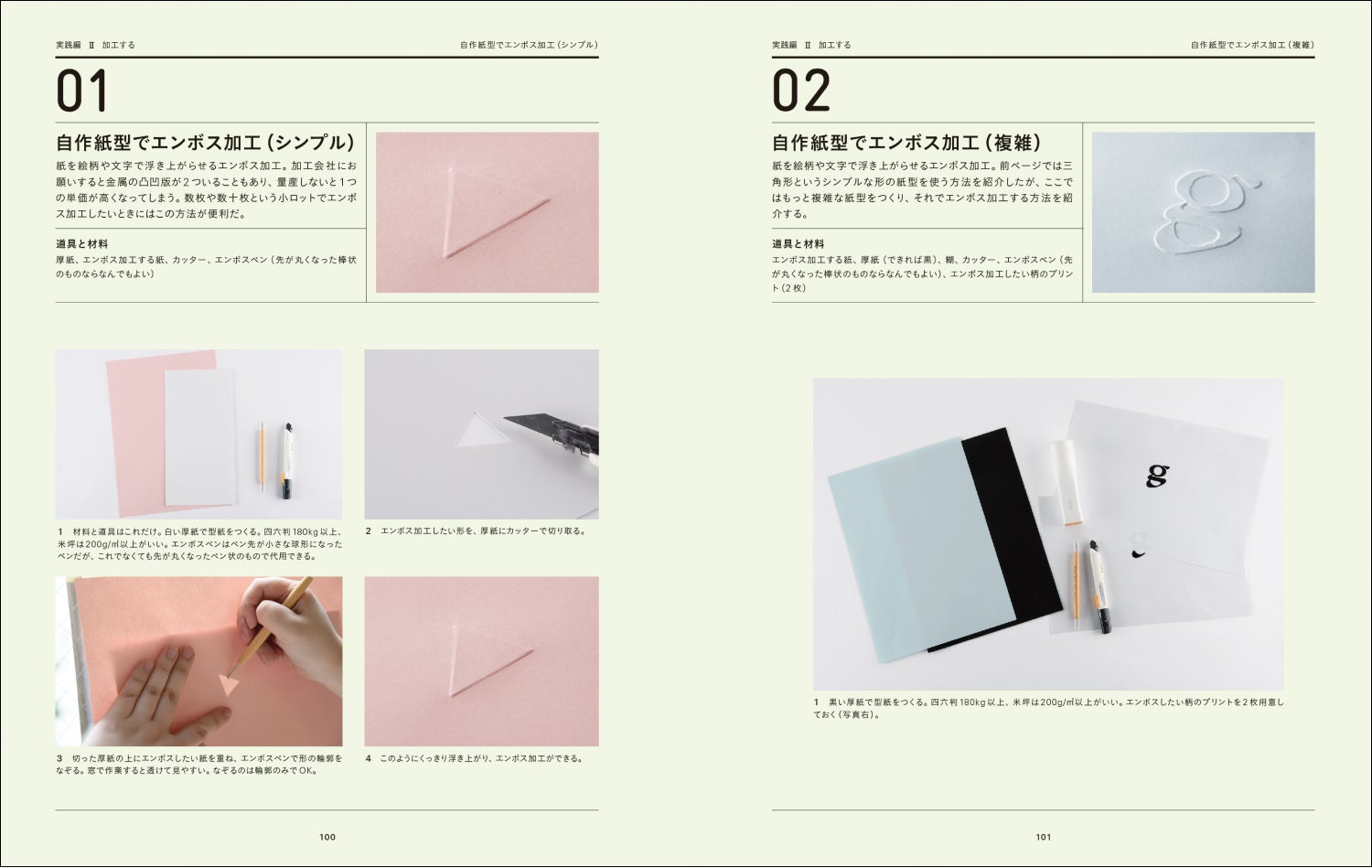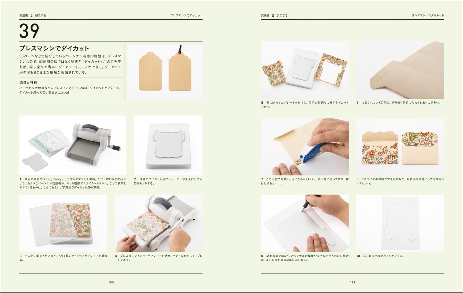 ●加工する→コーヒーや紅茶で紙をエイジング加工/打抜機で繊細なドット文字/ミシンで封緘/活版キットでくっきりエンボス/シールをつくる/プレスマシンでダイカット/自作紙型でエンボス加工/角留め箱