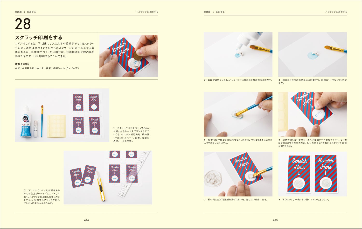 ●印刷する→パーソナル機で活版印刷/コピー機でオーバープリント/フロッキー加工/ガリ版印刷をする/バーコ印刷のような盛り上げ印刷/カードの小口に色をつける/紙版画で印/スクラッチ印刷をする/透明ブロックで多色刷り