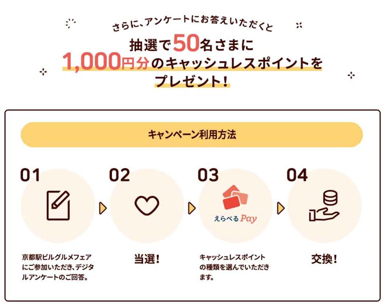 上記のデジタル抽選後、任意のアンケートに回答いただくと、抽選で50名様に「えらべるPay」で1,000円分のキャッシュレスポイントをプレゼントします。