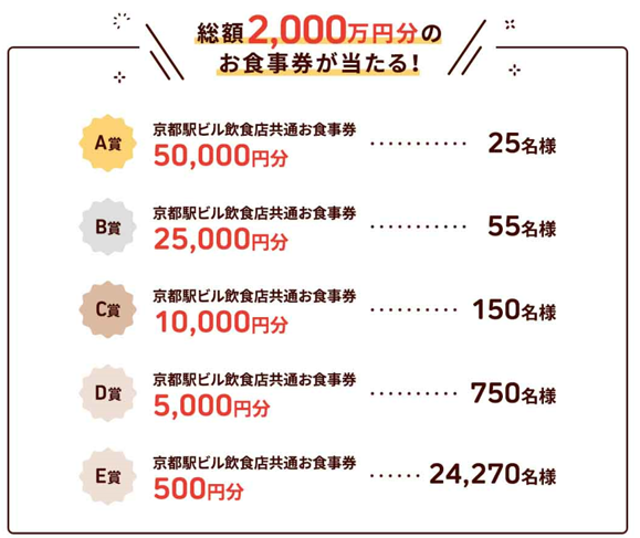 京都駅ビル内の飲食店でご利用いただけるお食事券をプレゼントします。