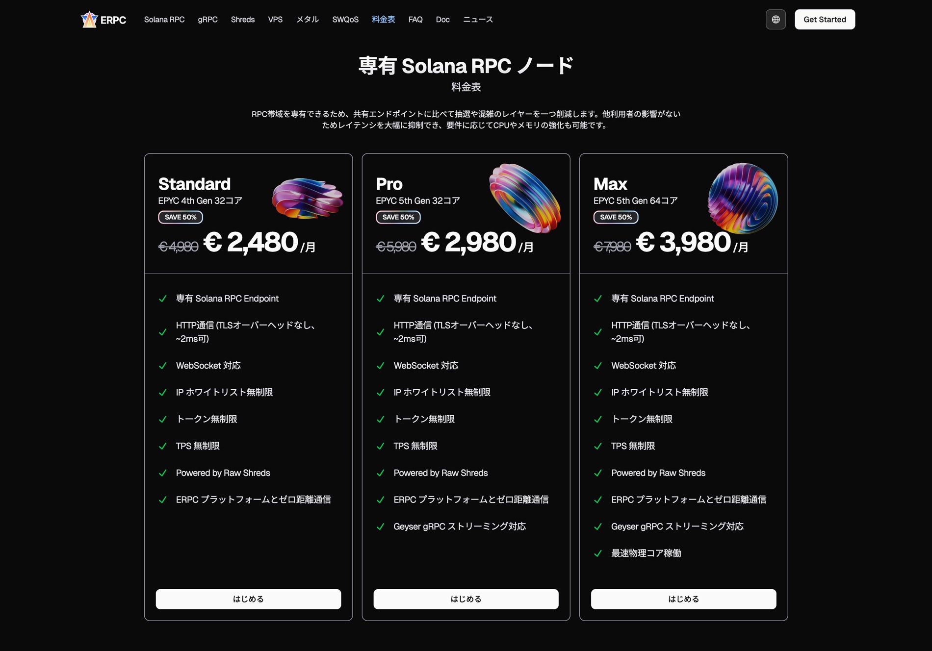 すべてのプランにおいて、専有 Solana RPC Endpoint、HTTP 通信、WebSocket 対応、IP ホワイトリスト無制限、トークン無制限、TPS 無制限、ERPC プラットフォームとのゼロ距離通信を標準で備えています。