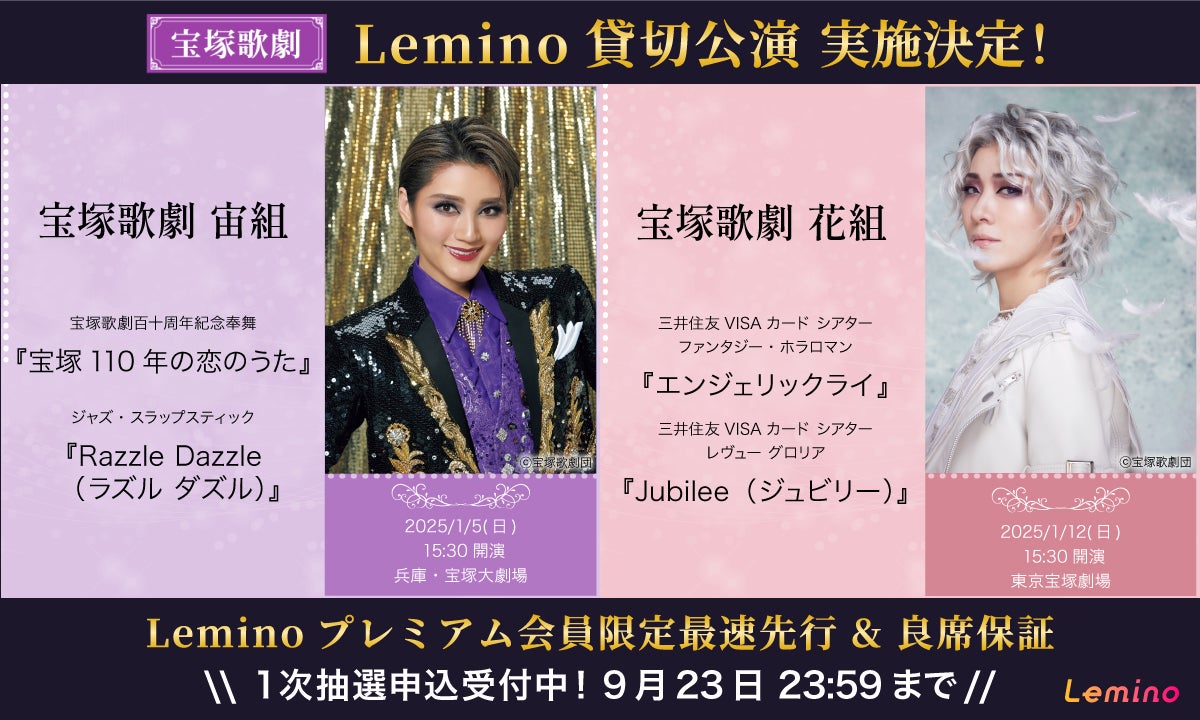 株式会社NTTドコモ(以下、ドコモ)は、映像配信サービス「Lemino®」において、2025年1月5日(日)に宝塚歌劇 宙組 宝塚大劇場公演『宝塚110年の恋のうた』『Razzle Dazzle(ラズル ダズル)』、2025年1月12日(日)に宝塚歌劇 花組 東京宝塚劇場公演 三井住友VISAカード シアター『エンジェリックライ』『Jubilee(ジュビリー)』の貸切公演を実施いたします。