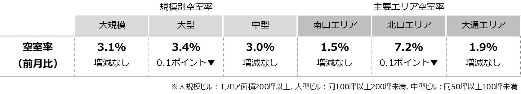 空室率は前月比マイナス0.02ポイントの3.10%となり、前月からほぼ横ばいとなった。集約移転に伴う解約床が現空となった一方、館内増床や拡張移転等で空室消化が進んだことから、わずかな動きに止まっている。潜在空室率は前月比マイナス0.05ポイントの4.30%だった。