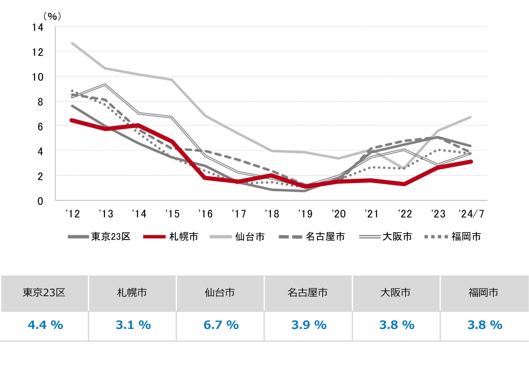 三幸エステート株式会社(本社:東京都中央区、取締役社長:武井重夫)は、2024年7月度の札幌市オフィス賃貸状況(空室率&現空面積:全規模、募集賃料&募集面積:全規模、規模別空室率、主要エリア※1空室率:全規模)および全国6大都市(東京・札幌・仙台・名古屋・大阪・福岡)の大規模ビルのマーケットデータをまとめた「オフィスマーケット2024年8月号札幌」を公表します。