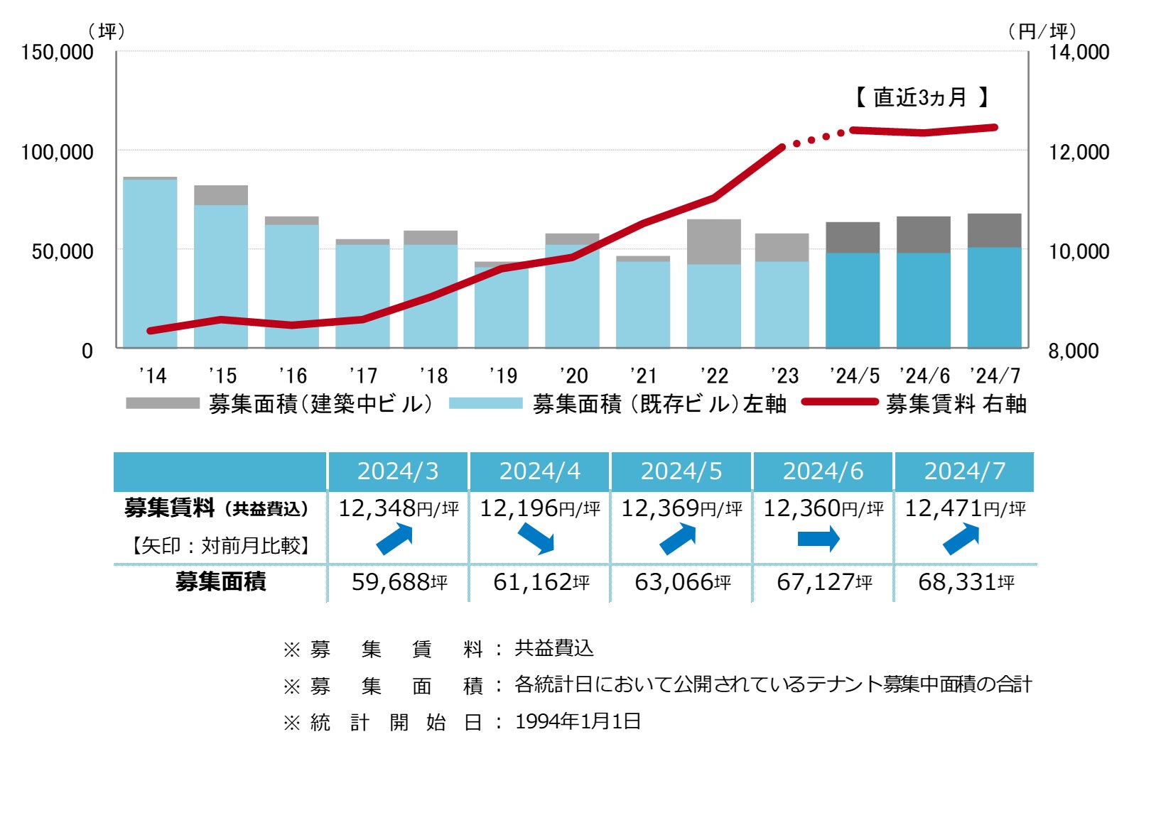 募集賃料は前月比プラス111円/坪の12,471円/坪となった。再び上昇し、募集賃料は統計開始以来の最高値を更新した。