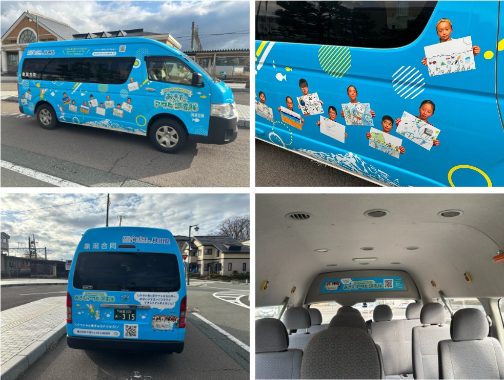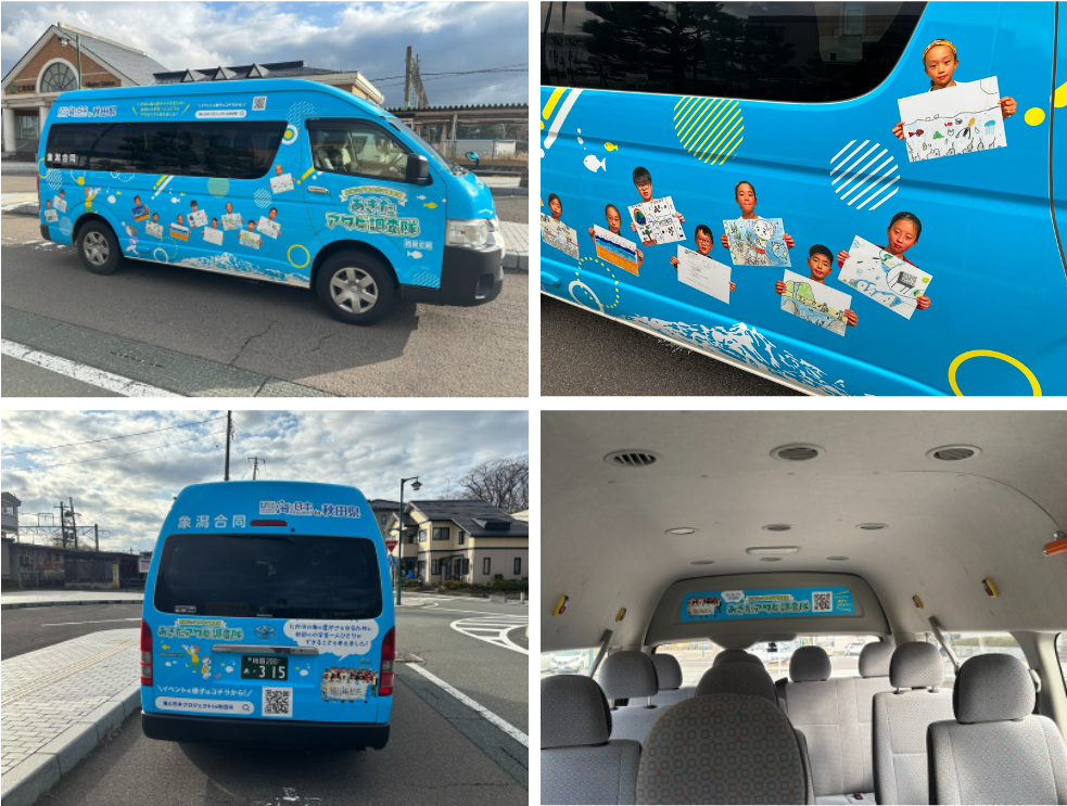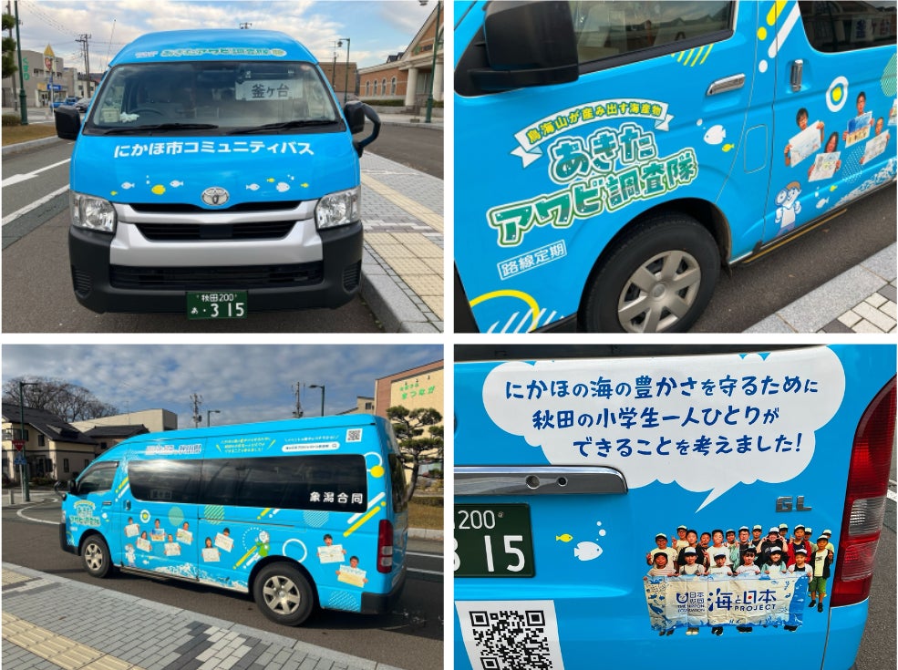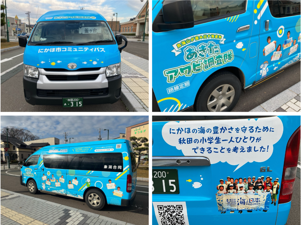 イベントでは一人一人が学んで知ったこと感じたこと、気が付いたことなどを1枚の絵やメッセージでまとめ、アワビや岩ガキの為に自分たちに何か出来るのかを発表しました。県民にもこのイベントを知ってもらい、秋田の海を守る行動を促すことを目的として、今回、にかほ市とコラボレーションしバスの車体に発表内容をラッピングしました。2025年12月1日(月)から2026年11月30日までの1年間、子どもたちの思いがつまったバスはにかほ市内で運行します。