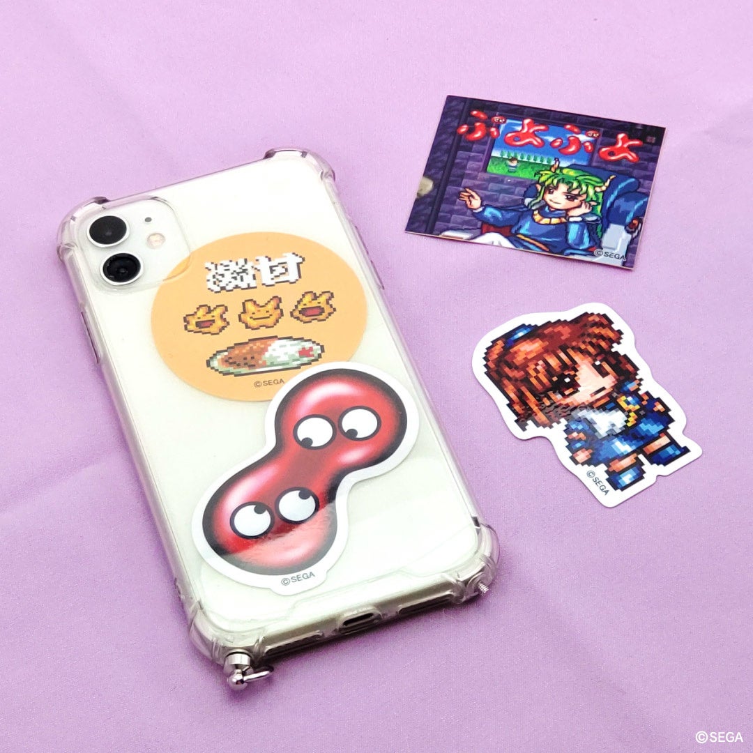 トートバッグ、iPhoneケース、クリアマルチケース、ステッカーは、平成レトロなピクセル風デザインを採用し、人気キャラクター「アルル」や「カーバンクル」を中心としたデザインに仕上げました。またゲーム内では「カーバンクル」の大好物であるカレーで難易度を表しており、「激甘カレー」のステッカーはプレイヤー心をくすぐるデザインです。