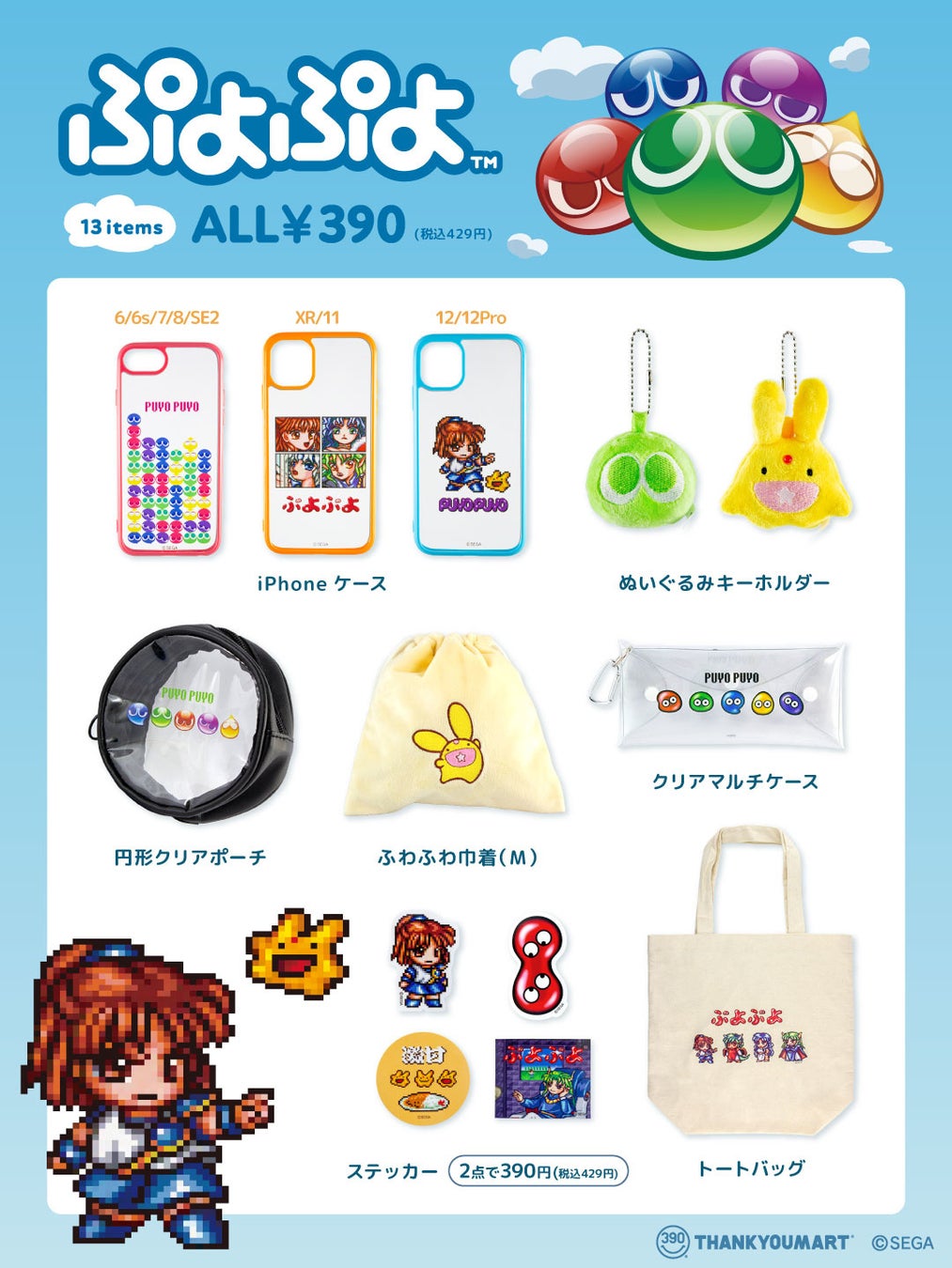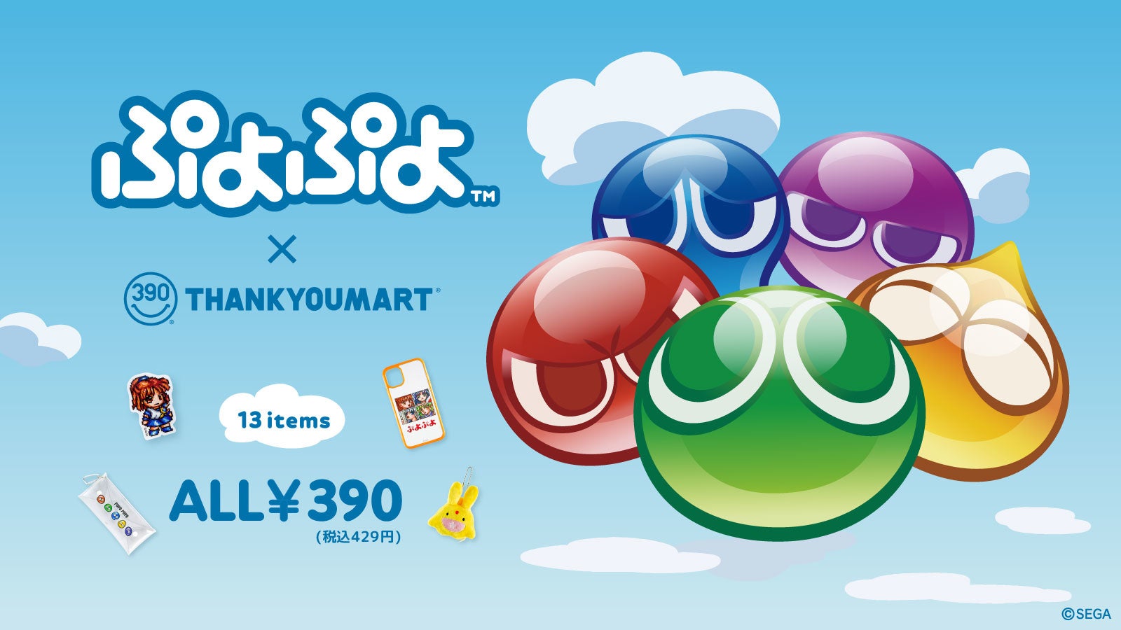 390円(税込429円)を中心としたかわいいアイテムが集まるショップ「サンキューマート」を運営するエルソニック株式会社は、株式会社セガの大人気ゲーム『ぷよぷよ』とコラボしたサンキューマート限定アイテムを5月下旬より入荷順次販売開始いたします。eスポーツ界においても注目が高まる『ぷよぷよ』の平成レトロな全13アイテムです。