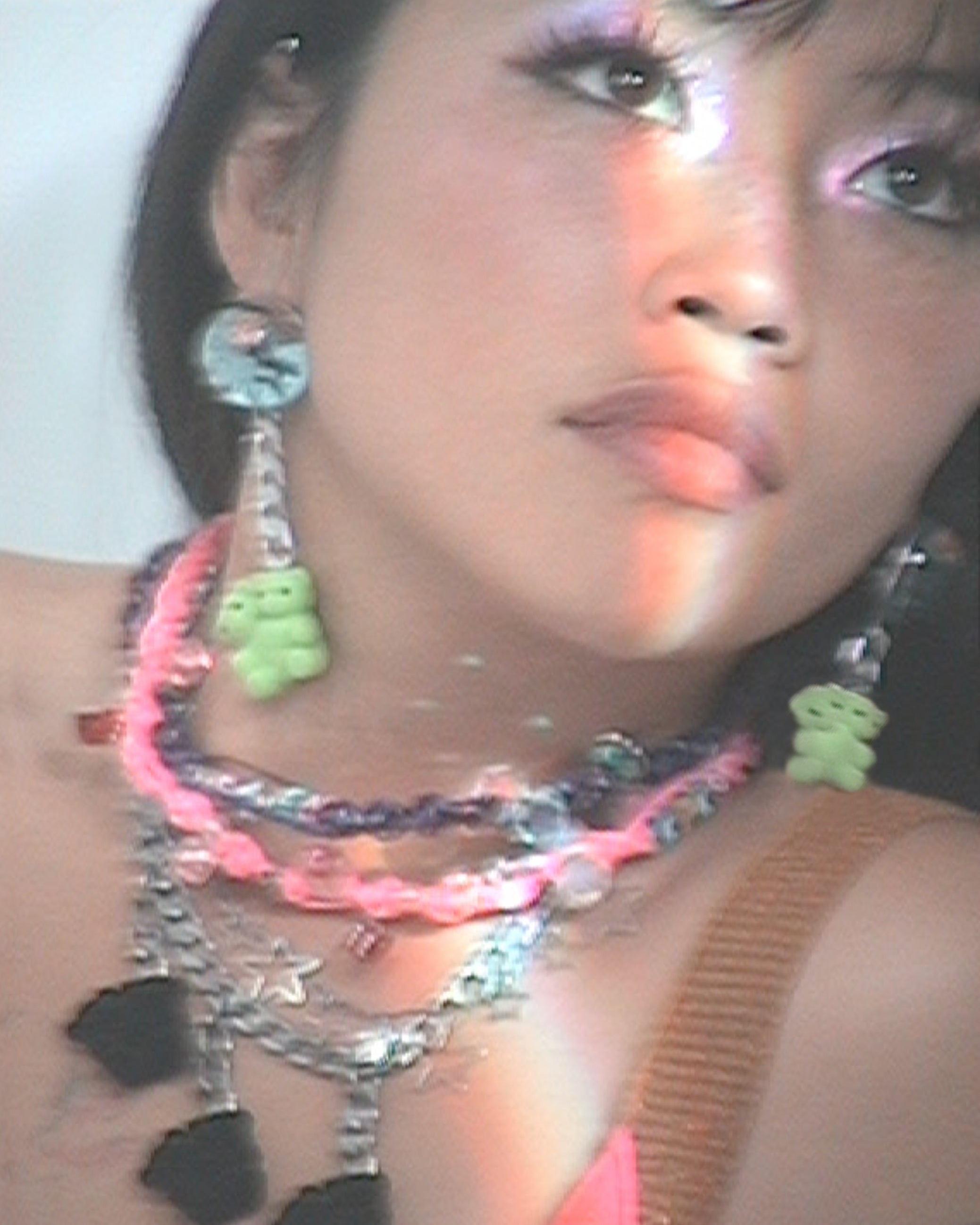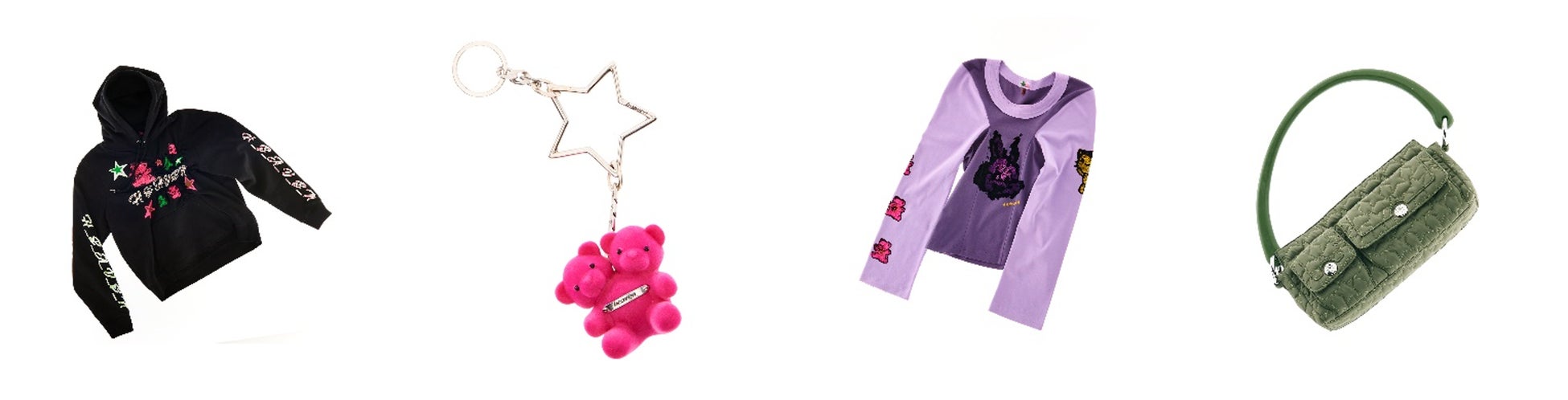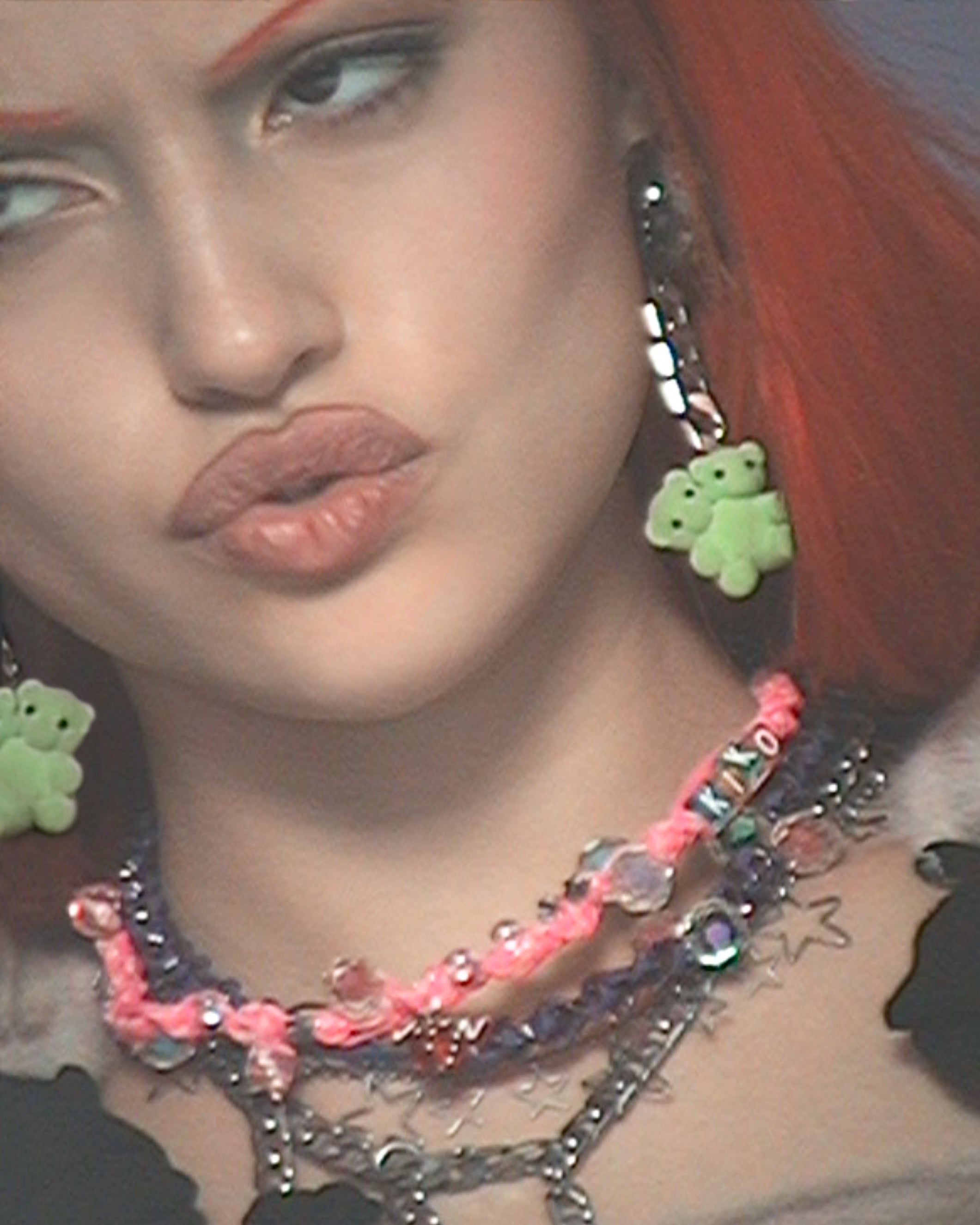 ローラとディアナは、Heavenのシグネチャーであるダブルヘッドベアをビーズリーの作品に置き換え、テディベアやウサギ、「招き猫」といった、若さと変化を象徴する儚いシンボルをパッチングし、Heavenのグラフィックへのアプローチを考えています。このシリーズでは、ニットの手仕事にマクラメビーズを施し、Marc Jacobsのアーカイブからインスピレーションを得ています。姉妹に代表されるミレニアル世代が持つ若さと共鳴し、女性として生きること、また大人になることへの不快感、生々しさ、衝撃的な本質に回帰するものです。アイコニックなHeavenのナイロンパフィバッグは、シリコンの持ち手で分けられるようになっており、過去のMarc Jacobsのシリーズよりボディと象徴的なダブルポケットを引用しています。