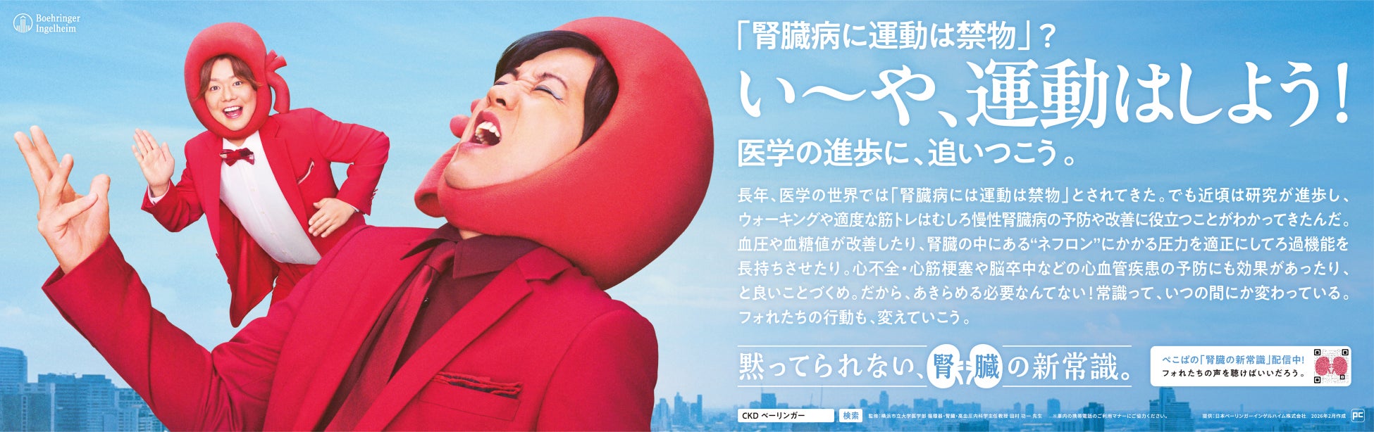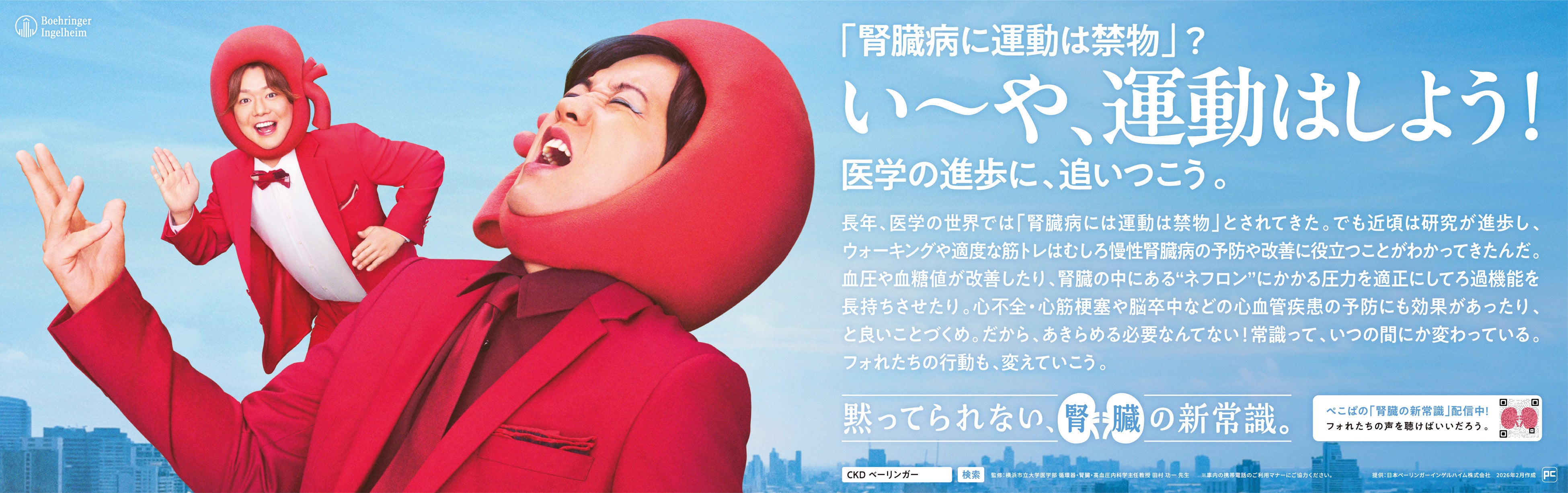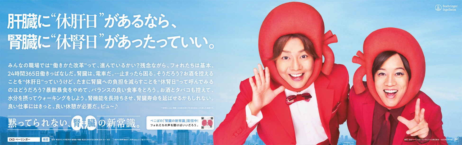 この度、日本ベーリンガーインゲルハイム株式会社(本社:東京都品川区、代表取締役 医薬事業ユニット統括社長:荻村正孝、以下、日本ベーリンガーインゲルハイム)は、2026年3月12日(木)の「世界腎臓デー(World Kidney Day)」に合わせ、「慢性腎臓病(CKD)」の疾患啓発キャンペーンを開始いたします。お笑いコンビ「ぺこぱ」(松陰寺太勇さん、シュウペイさん)を起用した交通広告によるトレインジャックを3月23日(月)から29日(日)の間、東京メトロおよび東急線にて「電車内ジャック(中づり貸し切り)」形式で実施するほか、Spotify・Podcastでの音声コンテンツ配信を展開中です。
