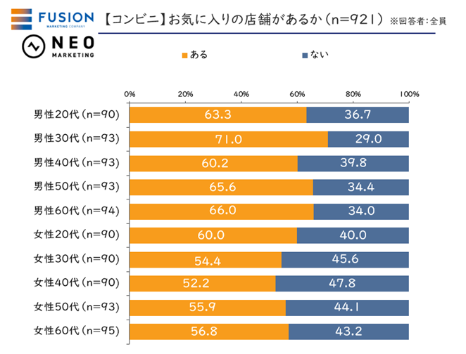 中でも30代男性の“お気に入り店舗”保有率は70%以上に。飲み物やタバコなど他の店舗でも購入できる商品だけでなく、夜ご飯などとしてコンビニオリジナルの惣菜や弁当を購入する機会が、女性より多い傾向のある男性。コンビニの独自商品にお気に入りができると同時に“お気に入り店舗”ができる、という背景があるのかもしれません。
