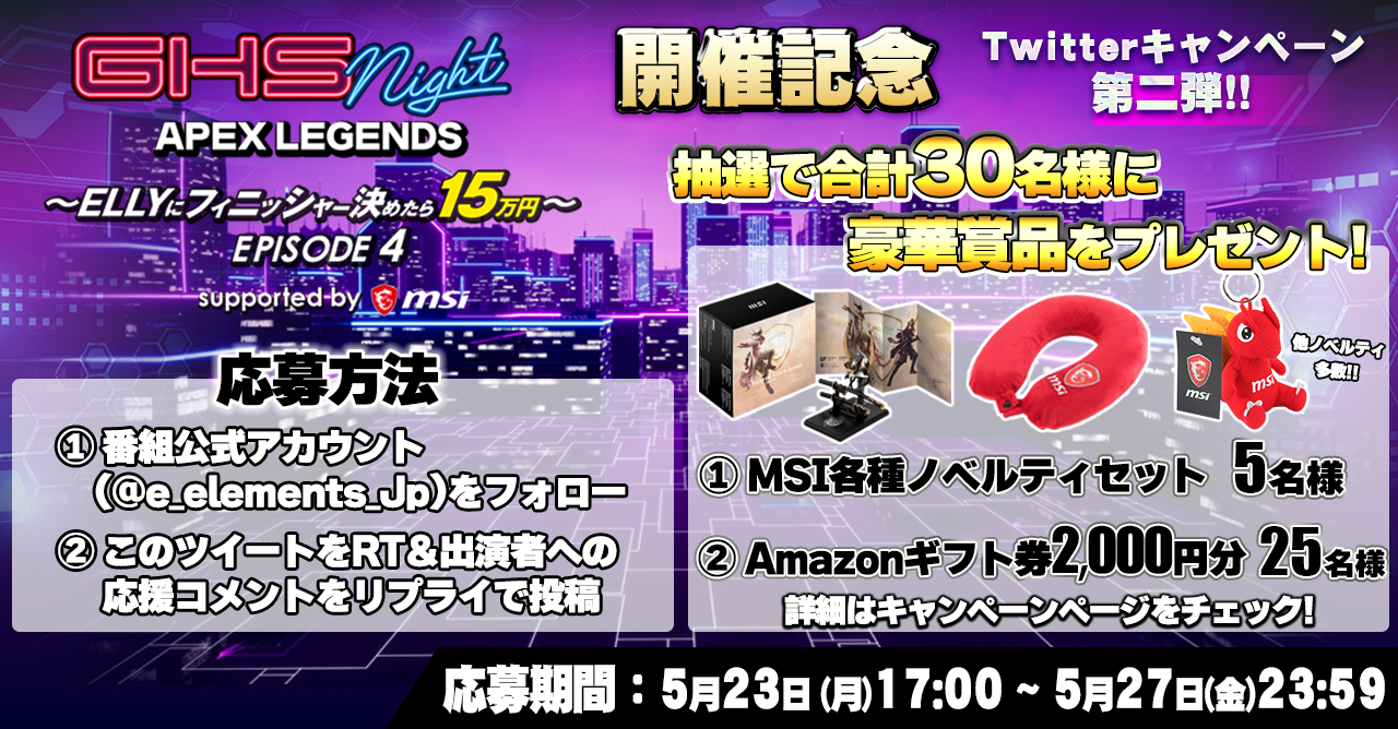 - 『GHS NIGHT APEX LEGENDS EPISODE4~ELLYにフィニッシャー決めたら15万円~』開催記念プレゼントキャンペーン