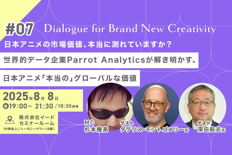 映像業界向けビジネスメディア「Branc(ブラン)」を運営する株式会社イード(本社:東京都中野区、代表取締役:宮川 洋)は、オフライン/オンラインイベント『世界的データ企業が解き明かす、日本アニメ「本当の」グローバルな価値 Dialogue for Brand New Creativity #07』を2025年8月8日(金)に開催します。