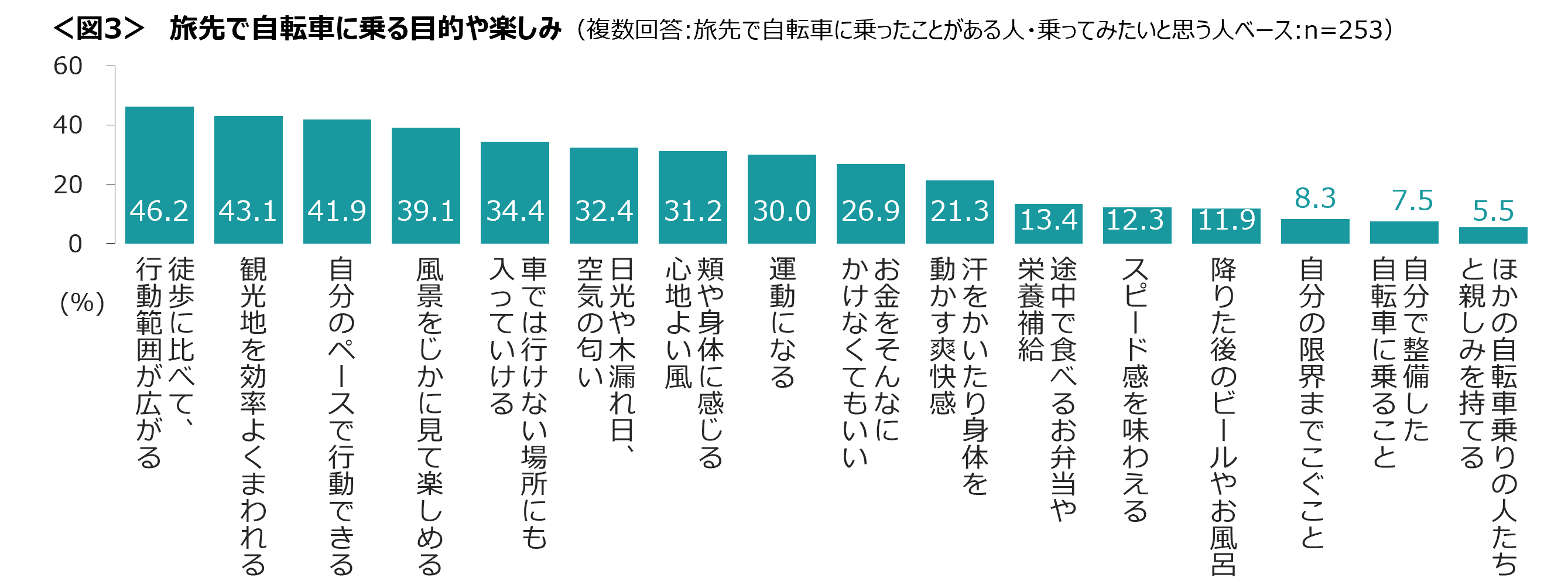 旅先での自転車利用の目的や楽しみとして、「徒歩に比べて、行動範囲が広がる」が46.2%でTOP。<図3>