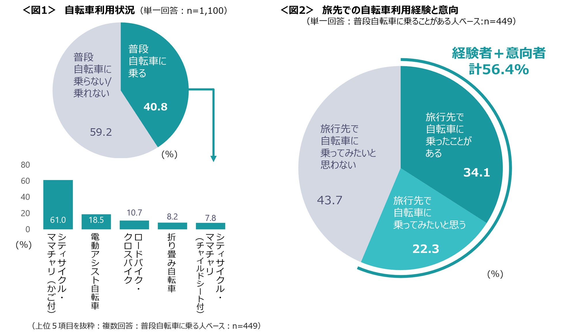 普段自転車に乗ることがある人のうち、旅行先で自転車を利用した経験がある人は34.1%。旅先での自転車利用は未経験だが旅行先で自転車に乗ってみたいと回答した人と合わせると56.4%の人が興味・経験があるという結果に。<図2>