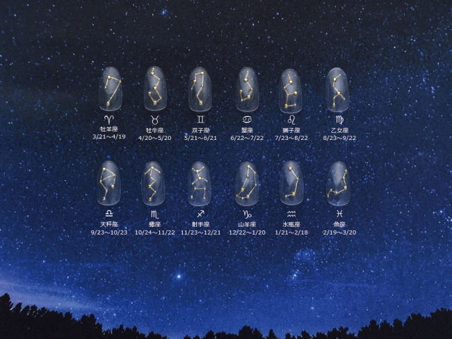 お好きなベースデザインに12星座の中からお好みの星座モチーフを追加、お客様一人ひとりが自分だけのネイルデザインを楽しんでいただけるものです。七夕シーズンにロマンティックな星座ネイルで、お客様の指先を幻想的に彩ります。