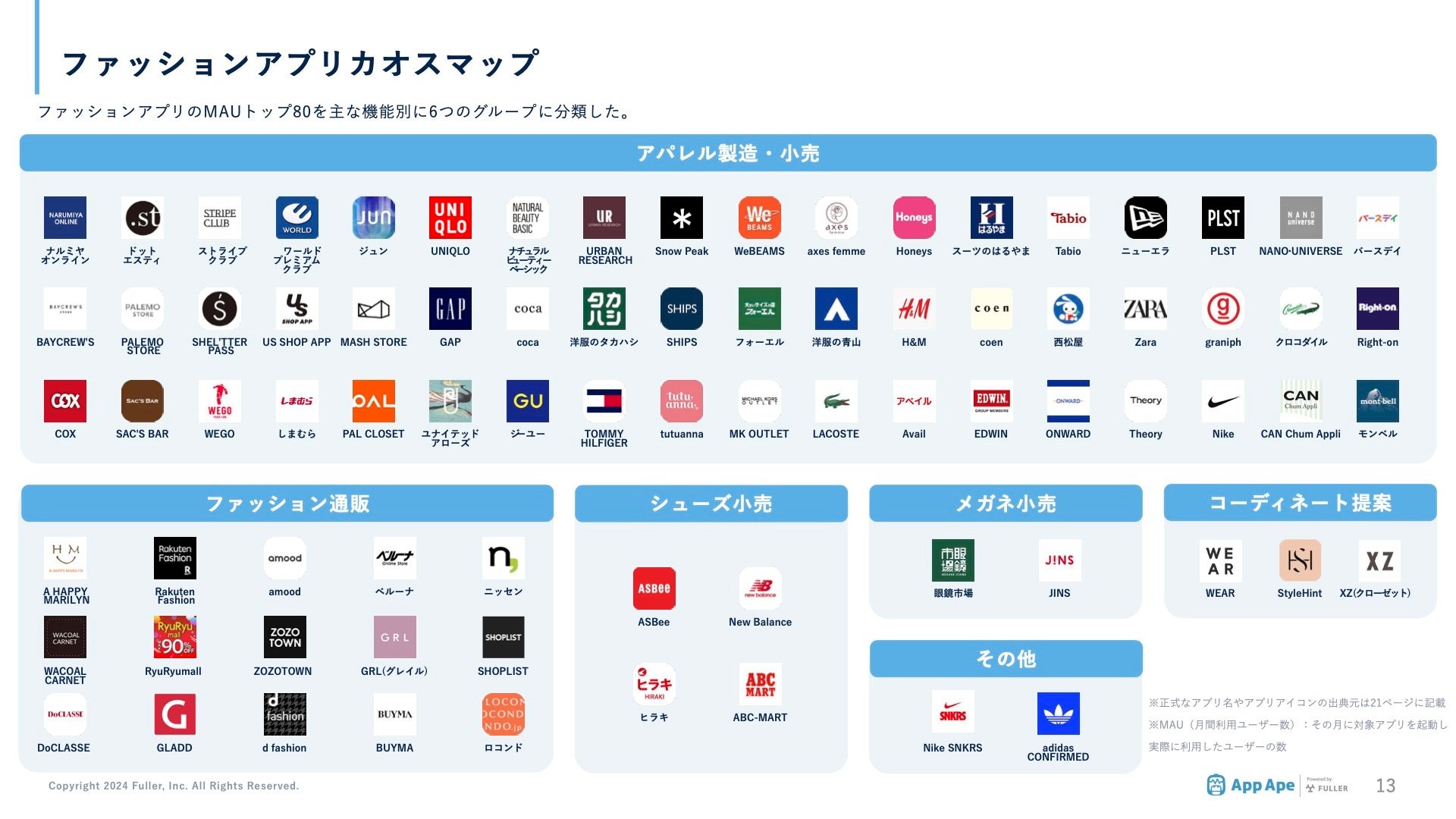 フラー株式会社(本社:新潟県新潟市、代表取締役社長:山﨑将司、以下「フラー」)は、アプリ市場分析サービス「App Ape(アップ・エイプ)」で蓄積するデータをもとに、アパレル製造・小売アプリやファッション通販アプリなどファッションアプリの動向や特徴をまとめた「ファッションアプリ市場レポート2024」を公開しました。