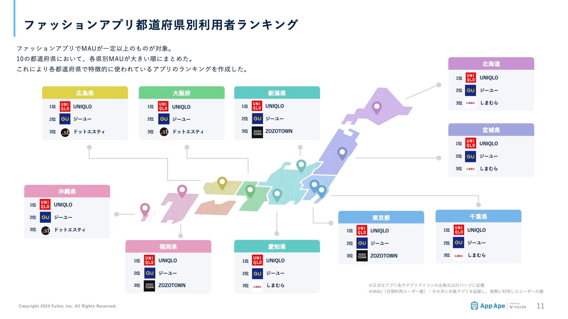 ファッションアプリでMAUが一定以上のものを対象に、10の都道府県において各県別MAUの大きい順にまとめ、各都道府県で特徴的に使われているアプリのランキングを作成しました。