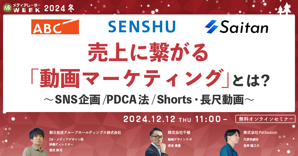 株式会社アイズ(所在地:東京都渋谷区、代表取締役社長:福島範幸、東証グロース:5242)が運営するNo.1*の広告業界のプラットフォーム「メディアレーダー」が主催するマーケティングセミナーイベント「第16回メディアレーダーWEEK 2024 冬」にて、動画マーケティングについての専門家たちが12/12(木)に登壇します。視聴申し込みは無料です。