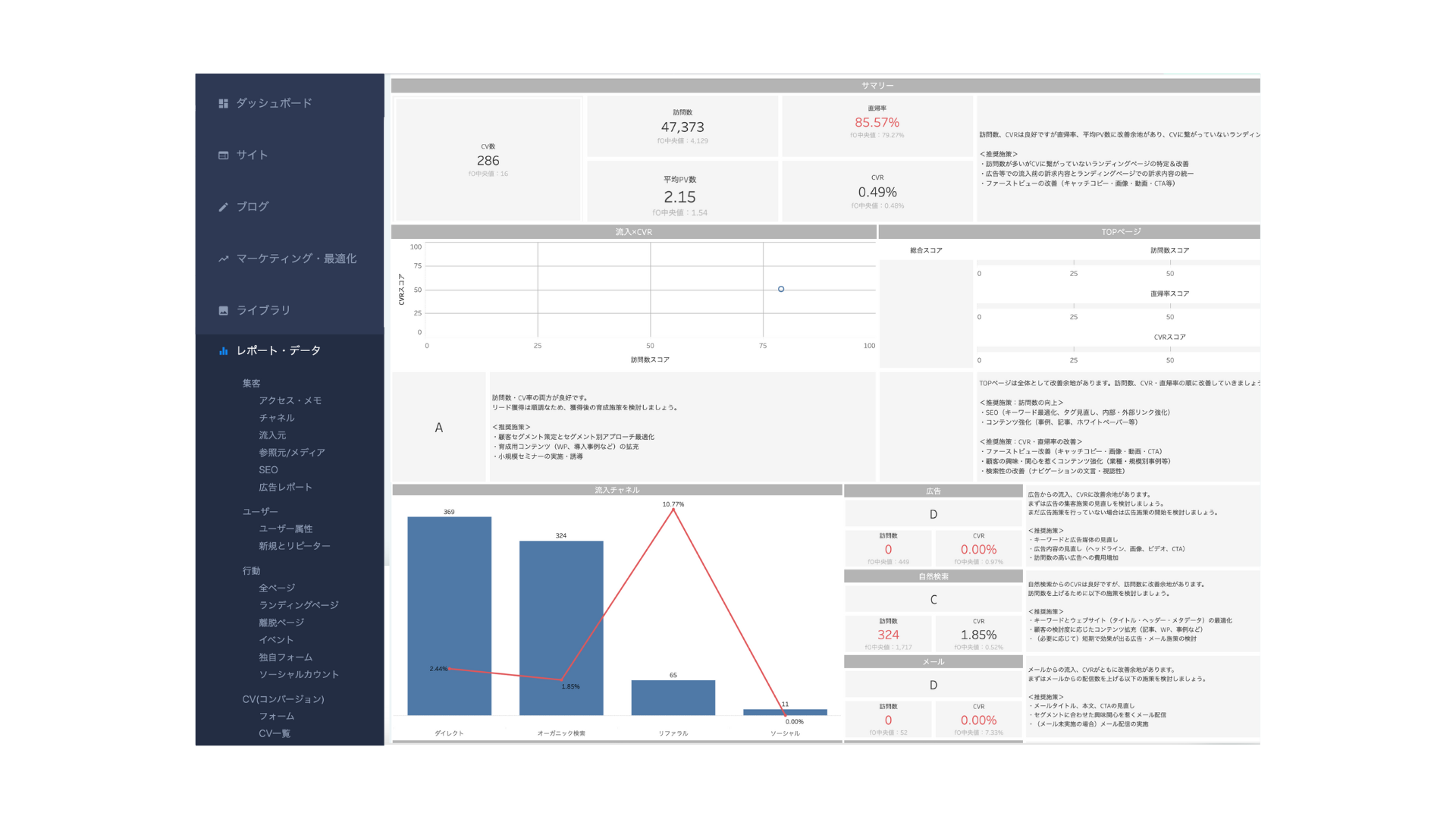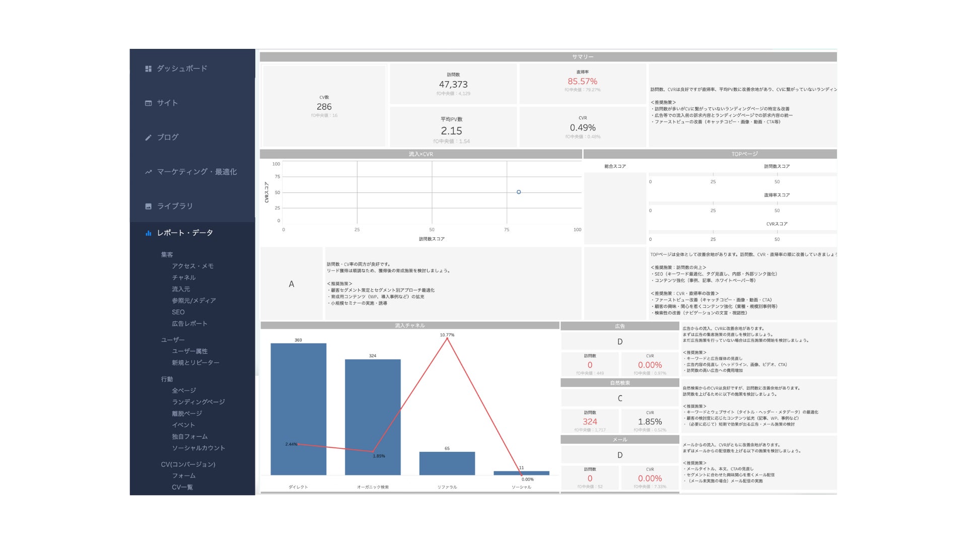 「検索経由の流入だけを分析したい」「ブログからの訪問者の分析をしたい」など、さらに詳細な分析が必要な場合でも、シンプルな操作で、問題や改善策の確認が可能です。これにより、サイトの健康状態をより詳細に確認でき、素早く改善することが可能です。
