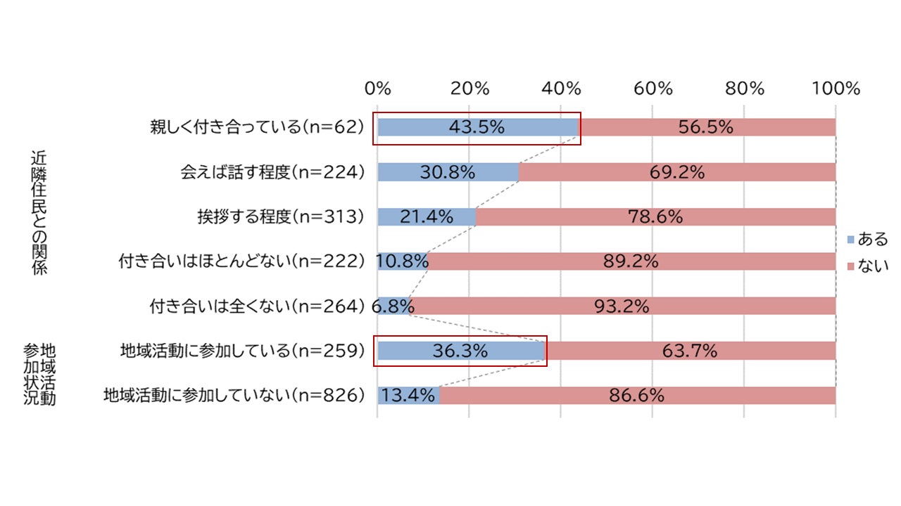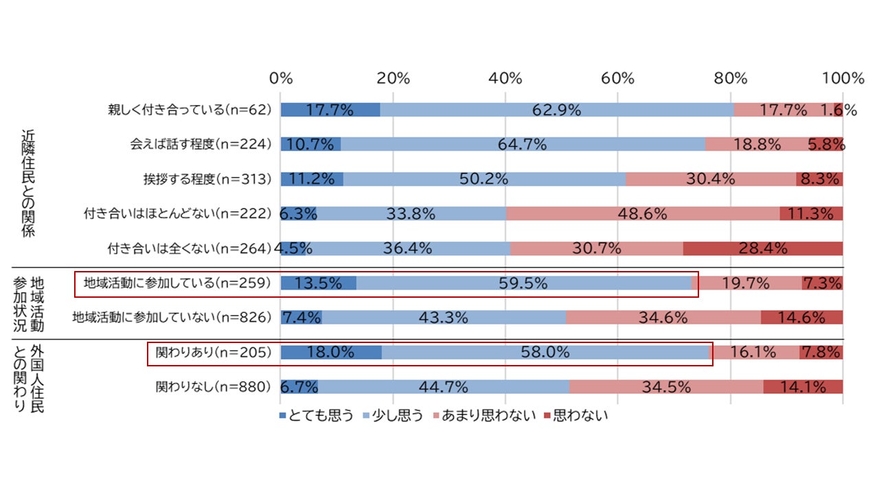 日常的な外国人住民との関わりを調査したところ、3人に1人が自身の身の回りで外国人住民の増加を実感しており、5人に1人は外国人住民と日常的な関わりを持っていることが分かりました。中でも、近隣住民と親しい人や地域の活動に参加する人の方が、そうでない人に比べて、日常的に関係を構築している傾向があることが分かりました(図1)。