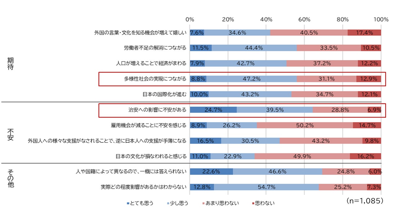 今後、日本に住む外国人が増えることについての期待として「多様性社会の実現につながる」とする回答が最も多く、不安の観点では「治安への影響」に対する回答が最も多い結果となりました(図3)。