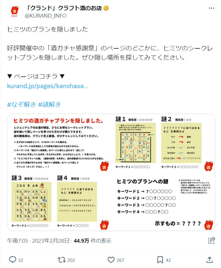 SNS上での期間限定開催のみだったため、「気付いた時には終わっていた」「SNSを見ないので知らなかった」などといった声も多く寄せられていたことから、より多くの方にクランドの謎解きプランをお楽しみいただくため、謎を解かないとお酒が買えない「謎の酒屋」の特設ページを開店しました。