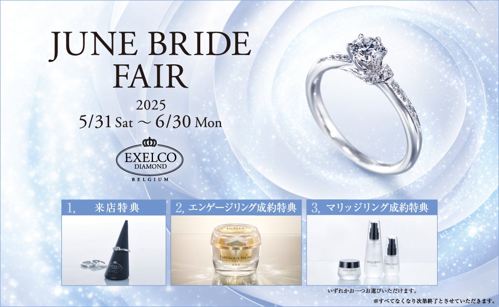 JUNE BRIDE FAIR(ジューンブライドフェア)▶https://www.exelco.com/lp/JUNE_BRIDE_FAIR_2025/