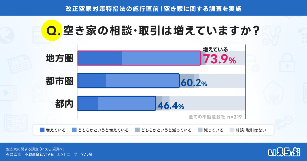 「空き家の相談・取引は増えていますか?」という質問に対して「増えている」「どちらかというと増えている」と答えた不動産会社は、地方圏で73.9%、都市圏で60.2%、都内で46.4%と、地方圏で大きく増えています。