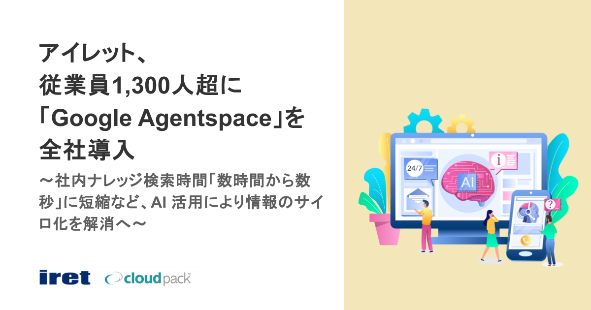 システム・アプリケーションの開発、グラフィック・UI/UX デザイン制作からインフラの構築・運用までをワンストップで提供するアイレット株式会社(本社:東京都港区、代表取締役社長:岩永充正、以下 アイレット)は、Google Cloud の次世代の生成 AI プラットフォーム「Google Agentspace」を、2025年9月に全従業員1,300人超を対象に全社導入したことを発表します。本導入により、従業員が社内情報を迅速に活用できる環境を構築し、業務効率の向上とお客様への提供価値の最大化を目指します。