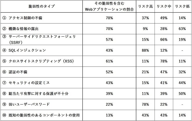 表:当社エキスパートによるWebアプリケーションの脆弱性トップ10(含まれる脆弱性の割合とリスクレベルの割合を基にランク付け。対象は2021年から2023年に実施したWebアプリケーションのセキュリティアセスメント※)