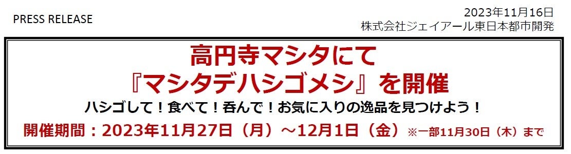 「高円寺マシタ」では、2023年11月27日(月)~12月1日(金)までの5日間、お得にお店をご利用頂けるキャンペーン「マシタデハシゴメシ」を開催いたします。