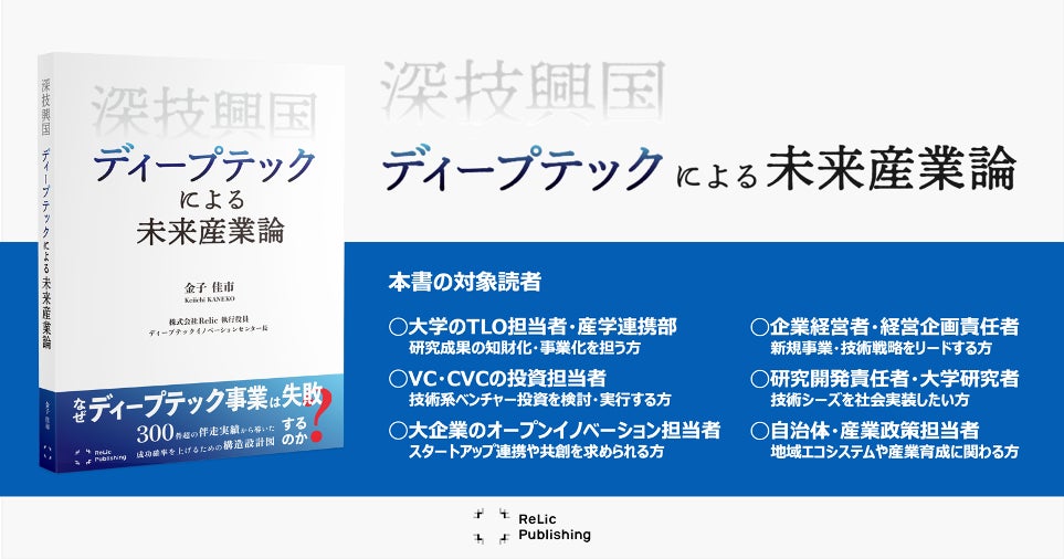 事業共創カンパニーである株式会社Relic(本社:東京都渋谷区、代表取締役CEO:北嶋貴朗、以下、Relic)が展開する出版レーベル「Relic Publishing」は、2025年10月1日(水)、第2弾書籍となる『深技興国 ディープテックによる未来産業論』(著:金子佳市)を刊行します。