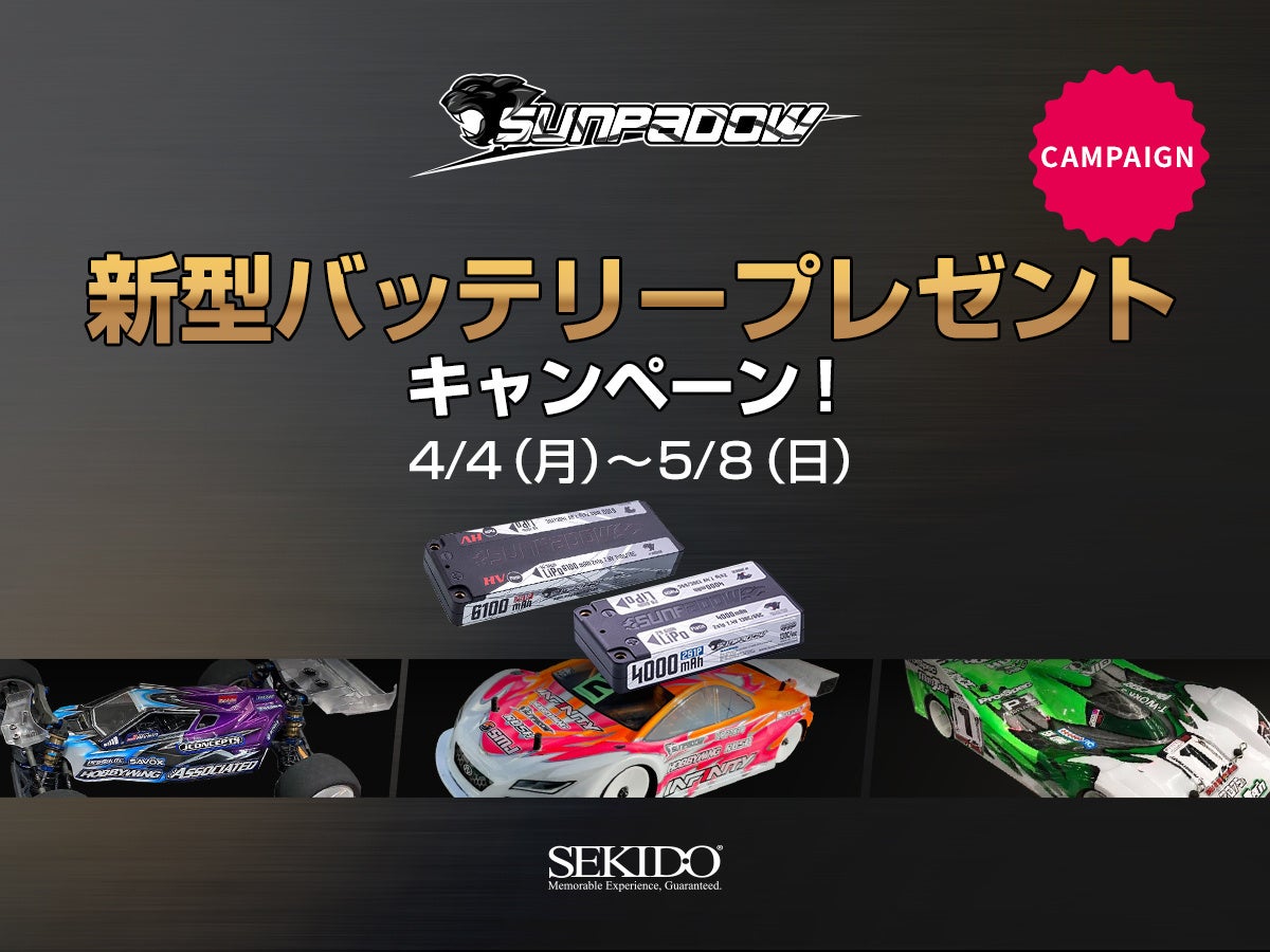 株式会社セキド(本社:東京都港区、代表取締役:⼤下貴之)では、5月8日(日)までの期間、日本総代理店を務める世界的ラジコン用リポバッテリーブランド「SUNPADOW(サンパドウ)」の製品を 8,000円(税抜)以上ご購入いただいた方の中から抽選で2名様に、最先端技術と厳選された材料を使用した SUNPADOW の最上級シリーズ 「Platinシリーズ」の新型バッテリーをプレゼントする「SUNPADOW 新型バッテリープレゼント キャンペーン」を開始いたしました。