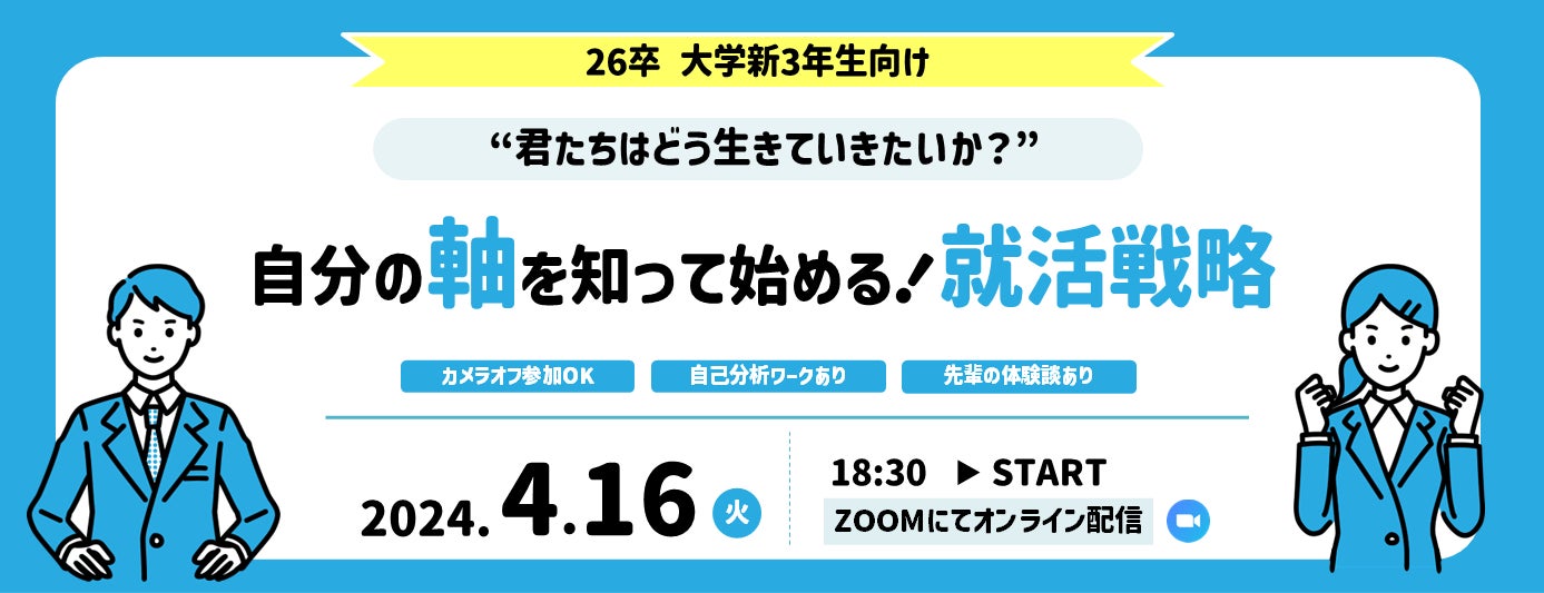 【4月16日(火)18:30開催 無料オンラインセミナー】新大学3年生向け 強みを生かして幸せをつかむための就活準備セミナー