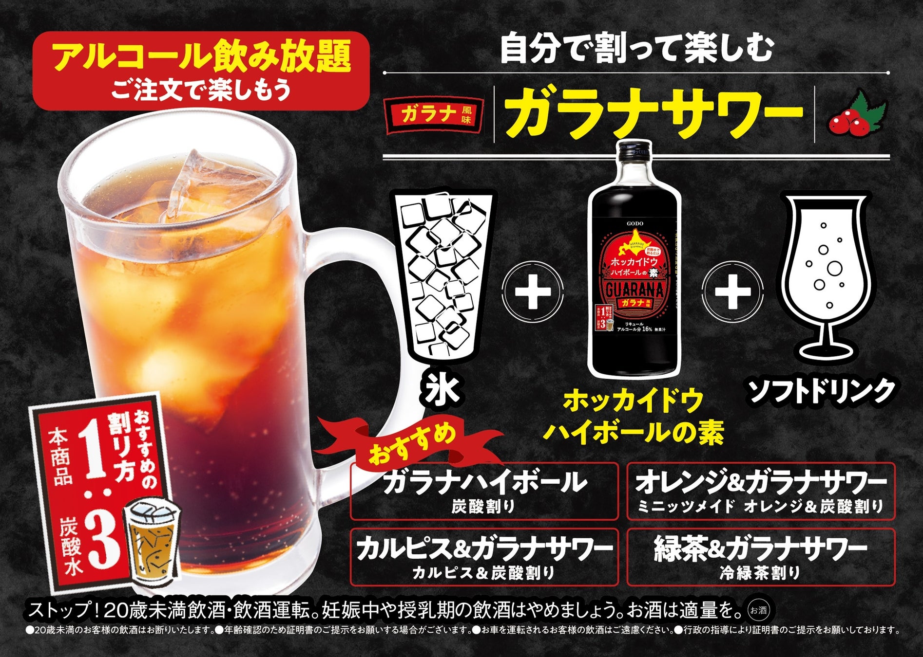 お好みの炭酸飲料やソフトドリンクで割ると、簡単においしいオリジナルガラナサワーが完成。自分好みの味や量で自由に作って楽しむことができます。